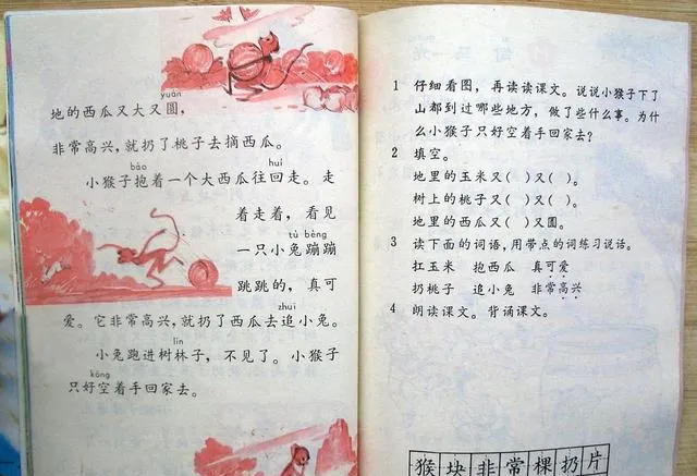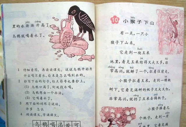 再往后翻,熟悉的东西就更多了。《乌鸦喝水》、《小猴子下山》、《司马光》,几乎一页翻过去,脑子里就能自动接下一句。很多人到现在都还记得“瓶子里的水不多,瓶口又小”“小猴子掰了玉米又去摘桃子”。这种记忆很奇怪,工作上的事未必记得住,小时候背过的课文,反倒几十年不忘。