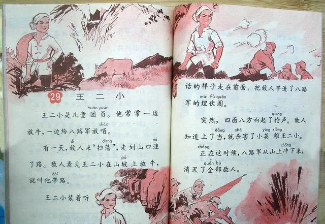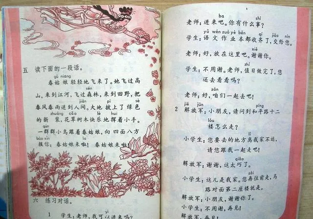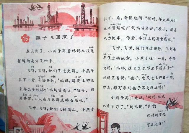 刚看到这组图的时候,我先注意到的,不是课文内容,而是那种老课本独有的颜色。纸张有点发黄,印刷是偏粉、偏红、偏蓝的老式套色,边角甚至还有一点磨损。现在的教材更清楚、更精致,可那种味道,真不是一回事。尤其是翻到写春天的几页,柳条、燕子、桃花、田野,一下就把很多人小时候的记忆勾出来了。