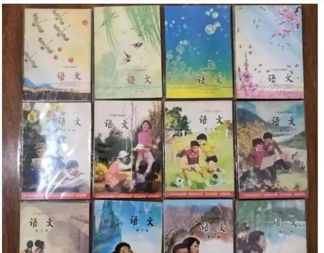 我很喜欢那张一整排语文课本封面的图。摆在一起看,才发现以前的教材封面真有审美,春夏秋冬、山水人物、孩子玩耍,各有各的颜色。它不是那种很用力的设计,但你一看就知道,里面装着的是一个学期的日子。