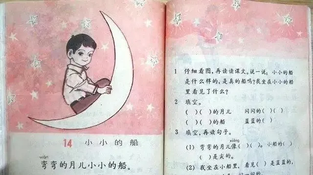 这组图里还有不少很有代表性的页面:《小小的船》、《春姑娘轻轻地飞来了》、《燕子飞回来了》,还有田野、河流、降落伞、风筝、祖国山河。说实话,小时候很多孩子没出过远门,但通过这些课文,已经在脑子里见过大海、海南岛、雪花飘舞的大兴安岭,也见过“弯弯的月儿小小的船”。