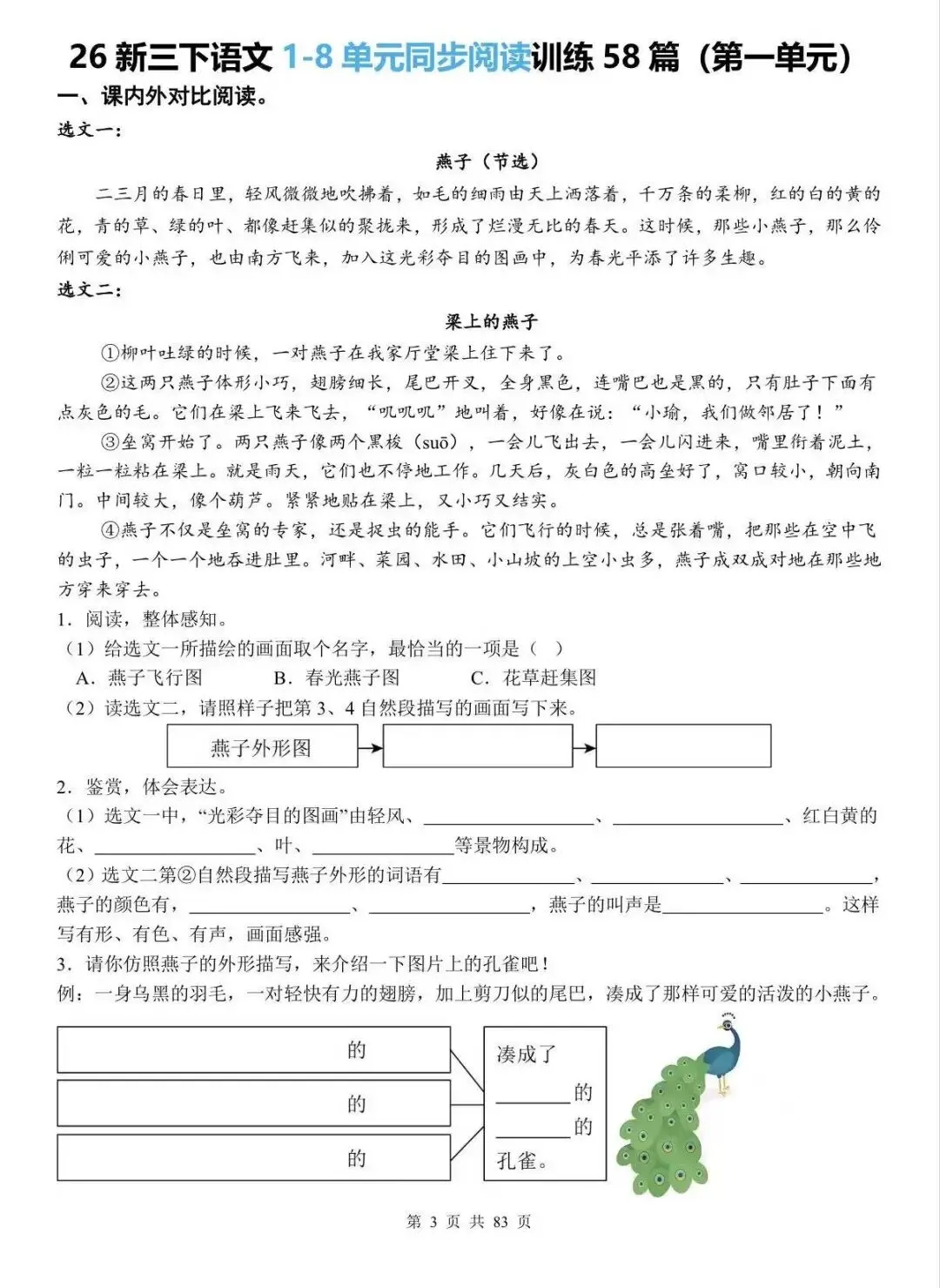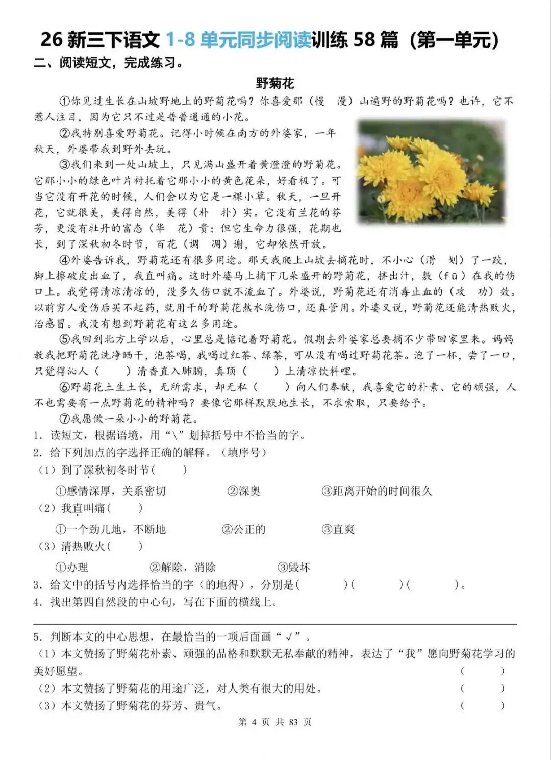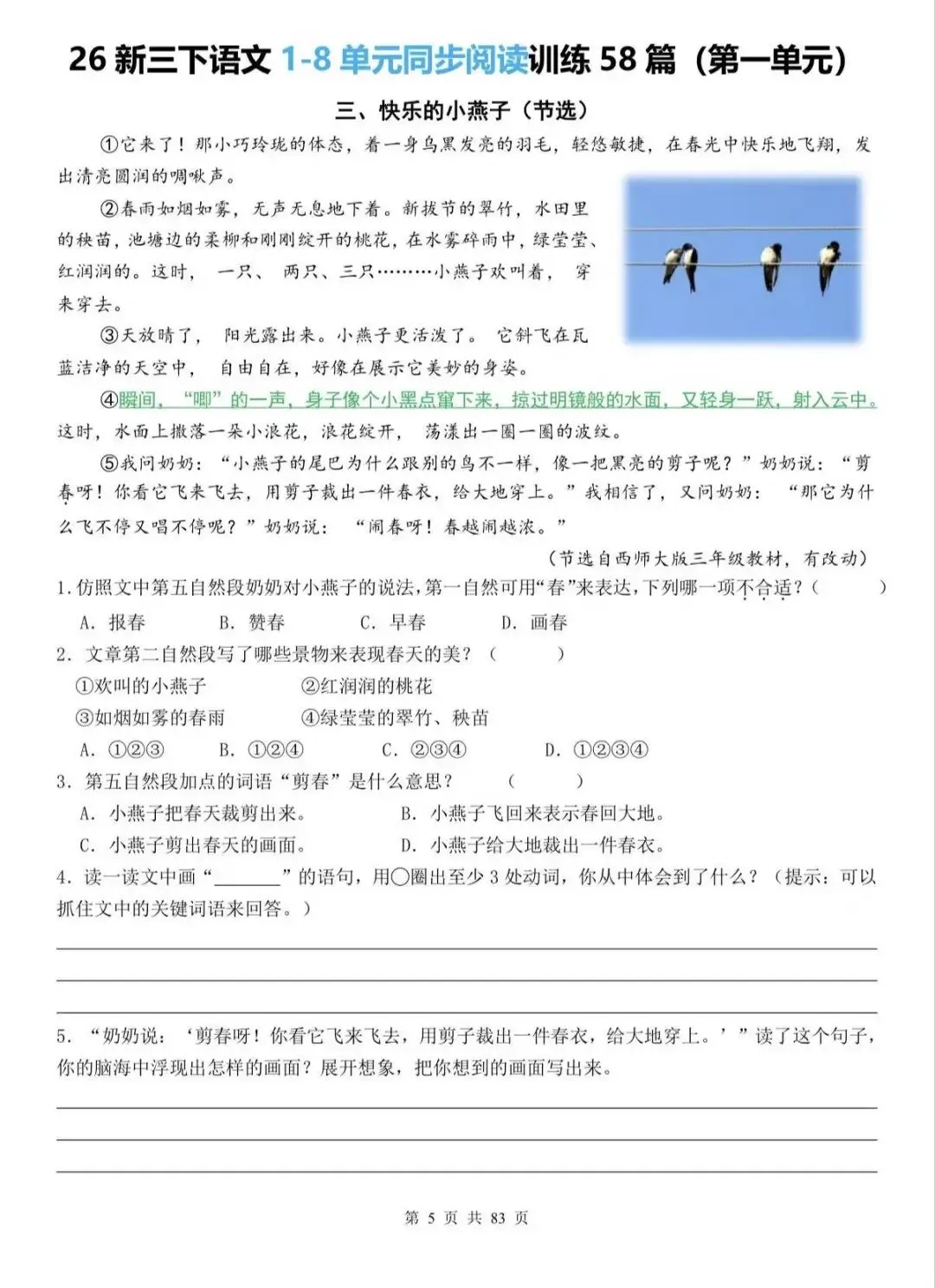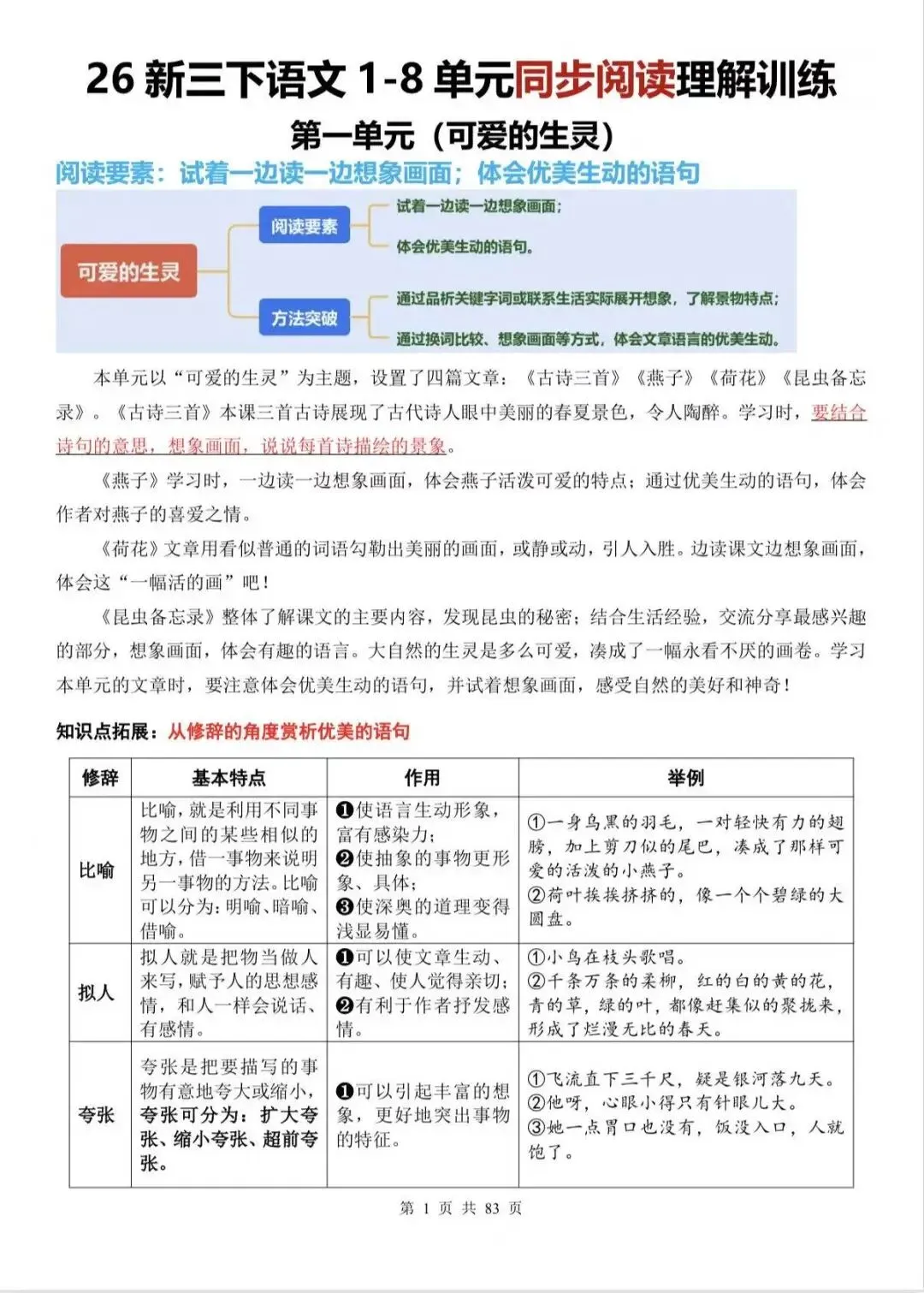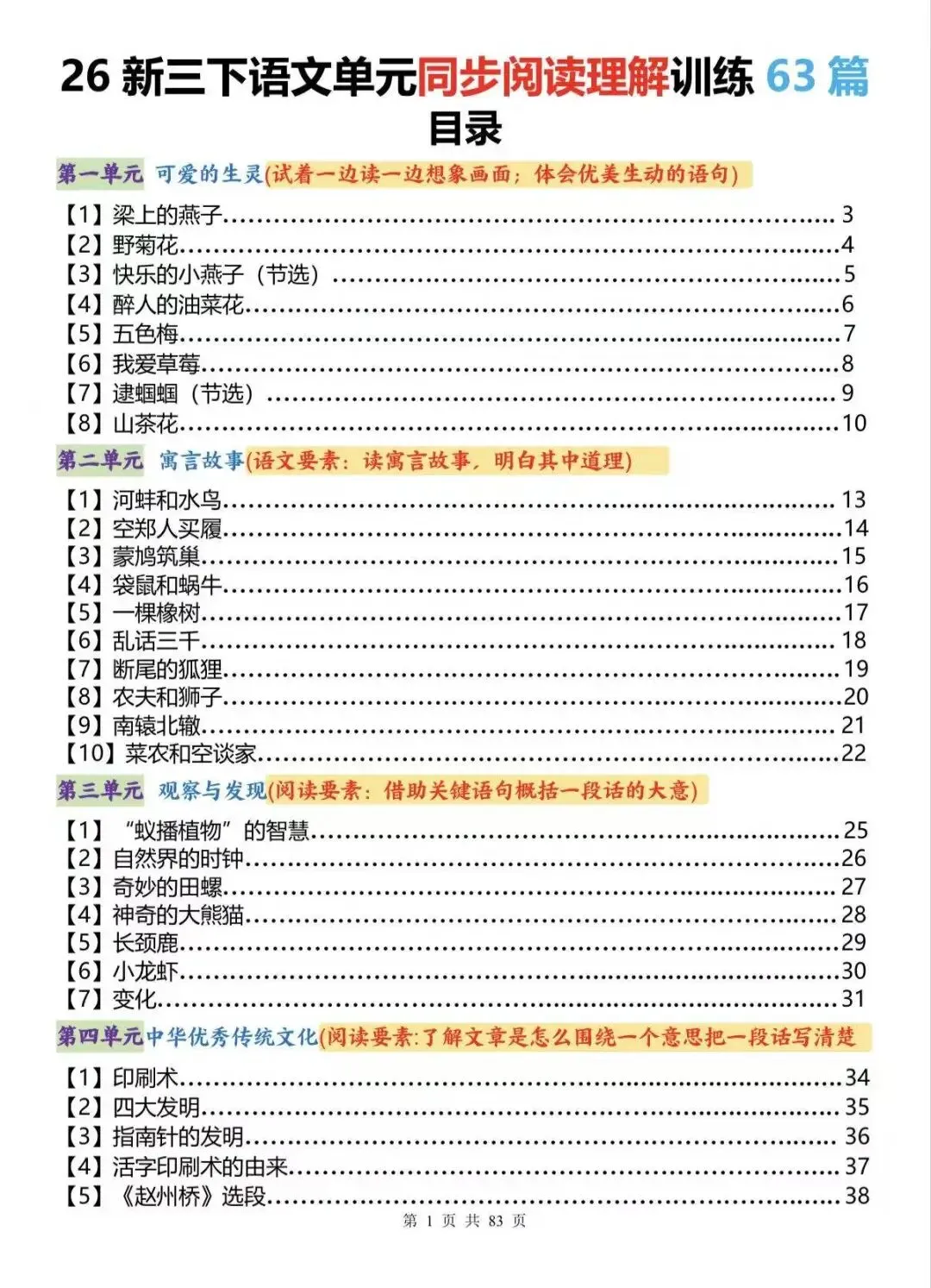 大家好我是提优补差;今天跟大家分享的是;小学三/四/五/六年级下册语文同步课本1-8单元主题阅读63篇:知识梳理+精选阅读训练,提供电子版,支持打印和下载。