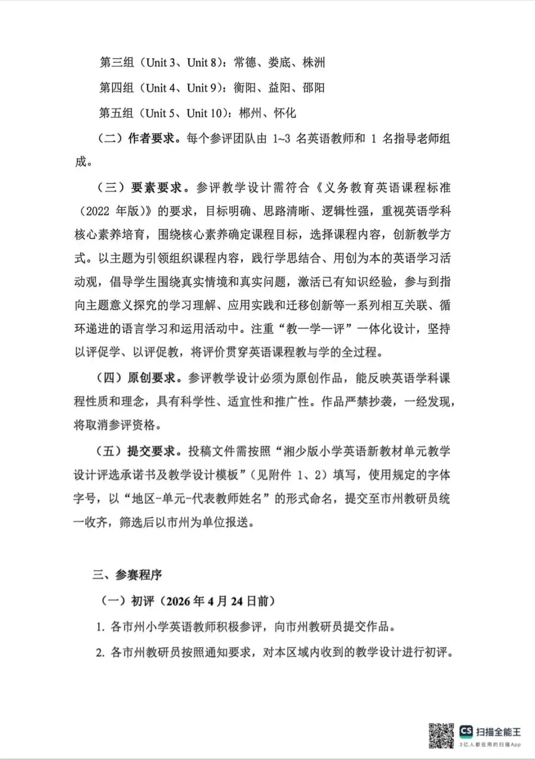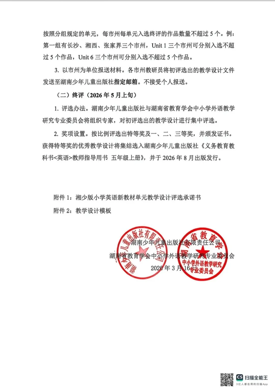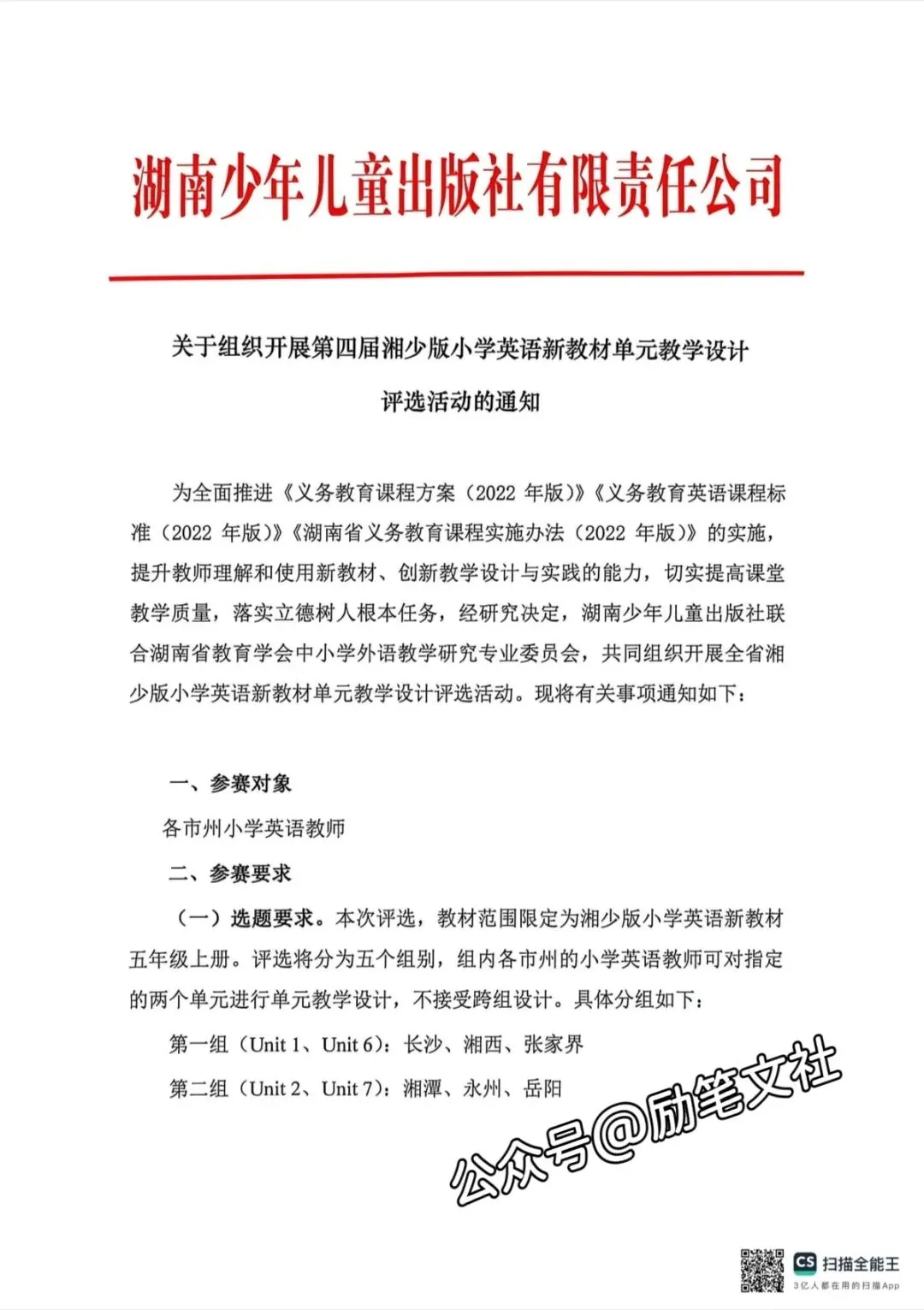 湖南省第四届湘少版(小学英语新教材单元教学设计)评选活动!
