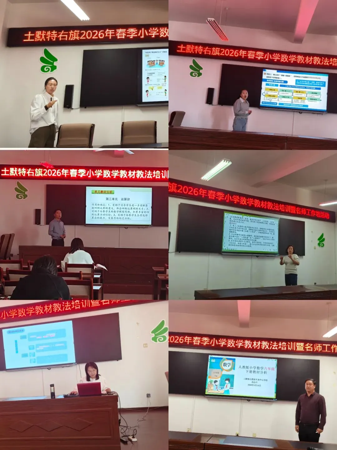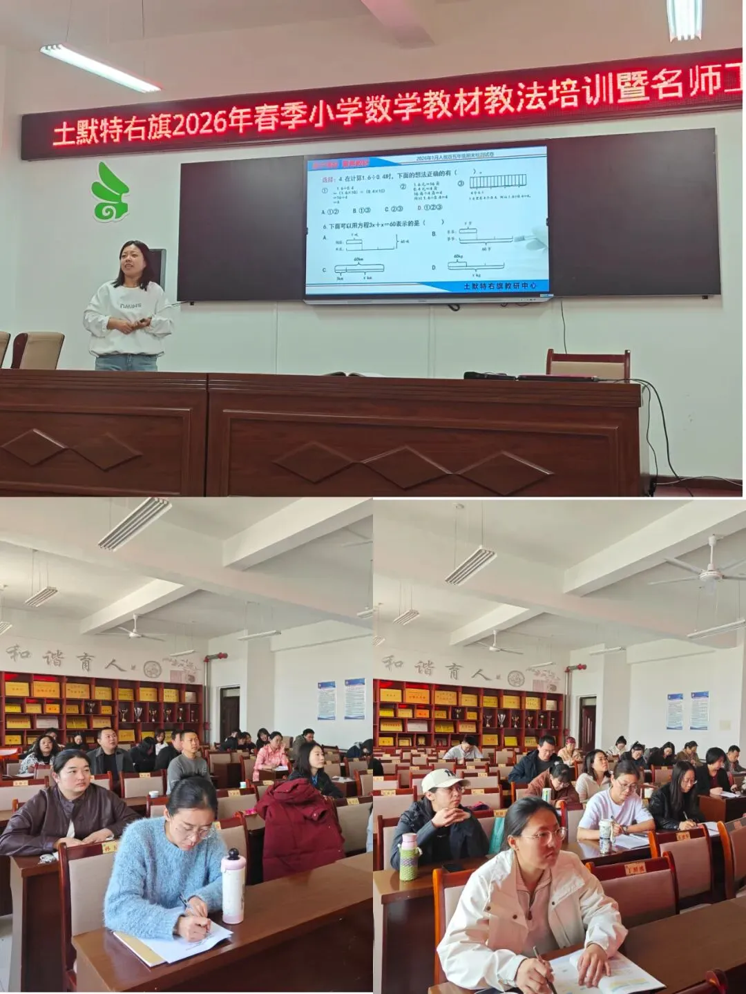 春风催奋进,教研正当时。为深入推进“基于课程标准的教学”,落实义务教育课程标准的课程理念,加强小学数学教师对教材教法的研究,发挥名师工作坊教师的示范引领作用,近日,土默特右旗2026年春季小学数学教材教法培训暨名师工作坊活动在阿勒坦校区举行,全旗175人参加。