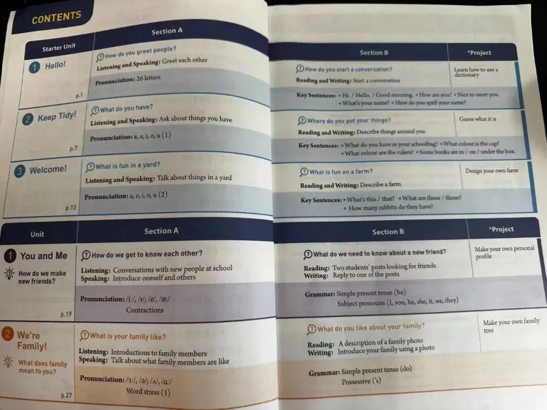 新教材拿在手里,第一感觉就是“英里英气”的,大家可以拿市面上的原版教材比较一下,排版和内容,都非常相似!对了,这里要提一点,现在小初高12个年级,只有三门课是统编教材——语文、历史和道法,其他科目各省之间,甚至同一个城市的各区之间用的版本都不同。主流的就是人教版、外研社、北师大版和译林版。