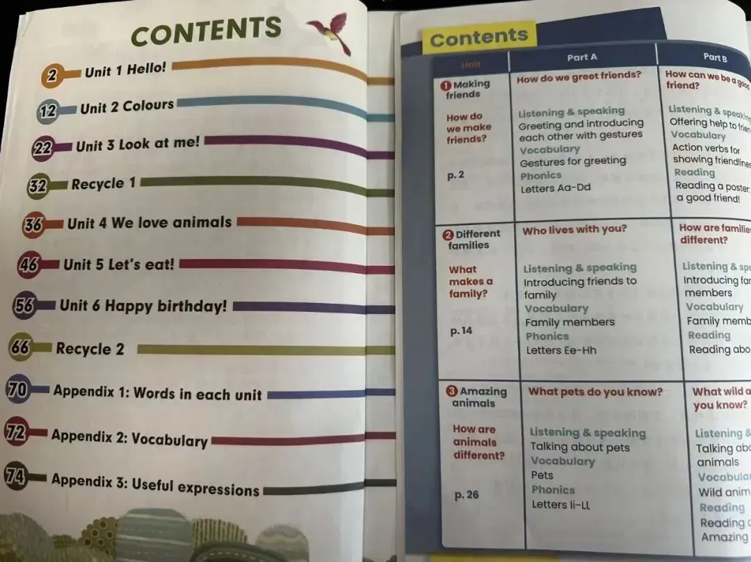 左边的是旧版,单元话题感觉还“看得到摸得到”——颜色、动物、生日等等。