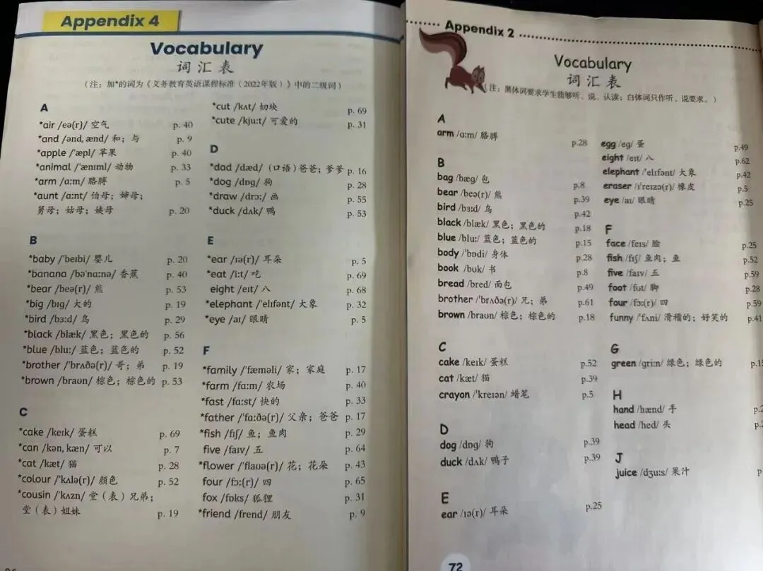 以三年级为例,新教材词汇表有两页多,旧教材只有一页半。