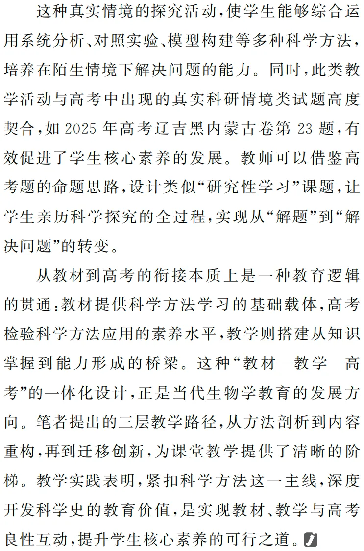 源 | 本文来自胡云.从教材到高考:高中生物学科学史中的方法教学探究[J].教学考试,2026,(15):27-29.