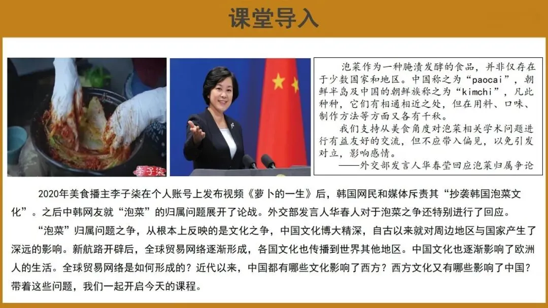 教师讲述:2020年美食播主李子柒在个人账号上发布视频《萝卜的一生》后,韩国网民和媒体斥责其“抄袭韩国泡菜文化”。之后中韩网友就“泡菜”的归属问题展开了论战。外交部发言人华春人对于泡菜之争还特别进行了回应。