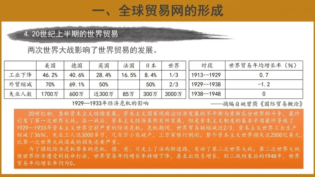 4.20世纪上半期的世界贸易:两次世界大战影响了世界贸易的发展。