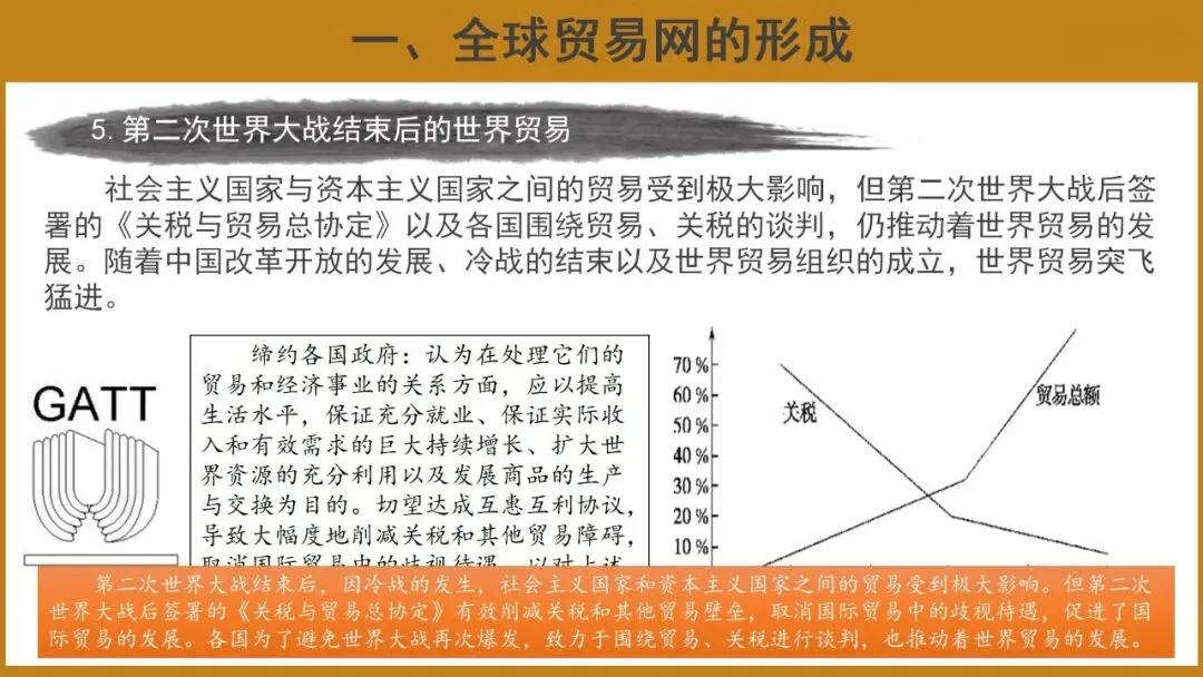 5.第二次世界大战结束后的世界贸易:社会主义国家与资本主义国家之间的贸易受到极大影响,但第二次世界大战后签署的《关税与贸易总协定》以及各国围绕贸易、关税的谈判,仍推动着世界贸易的发展。随着中国改革开放的发展、冷战的结束以及世界贸易组织的成立,世界贸易突飞猛进。