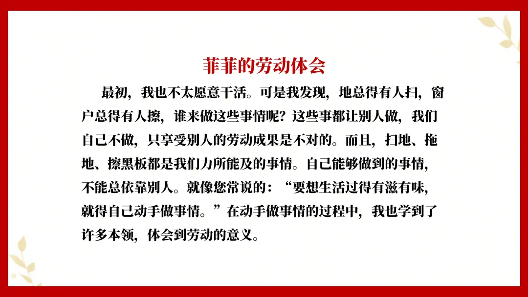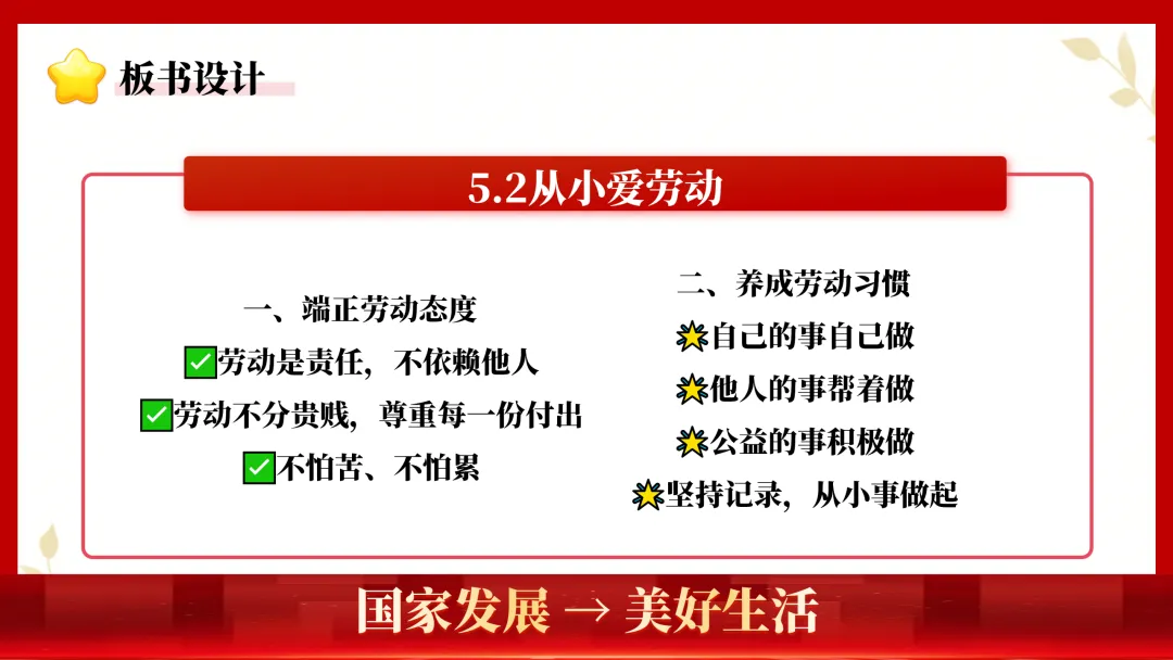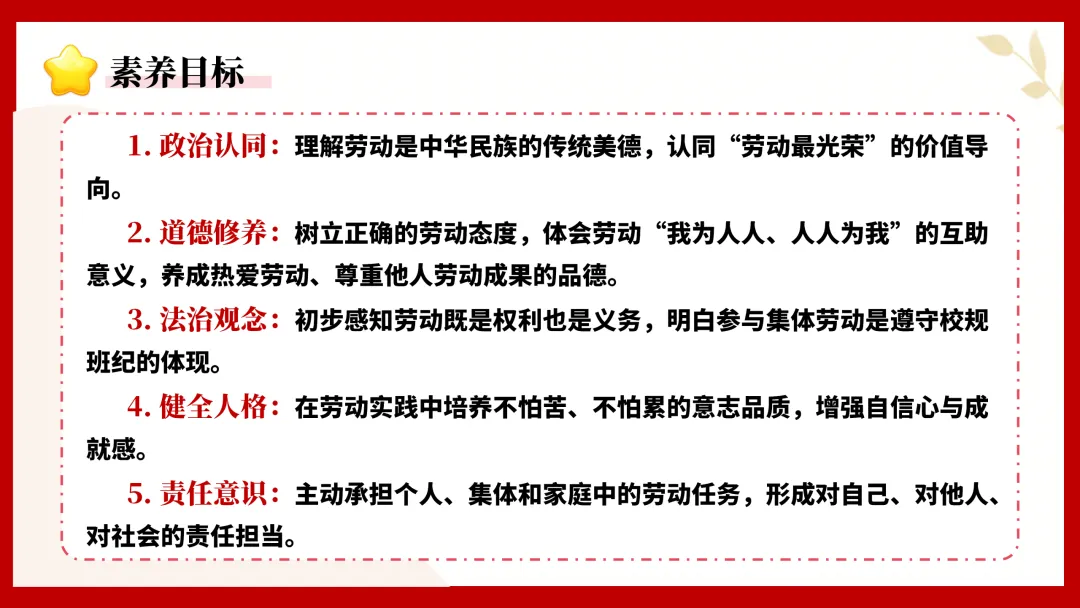 1. 政治认同:理解劳动是中华民族的传统美德,认同“劳动最光荣”的价值导向。