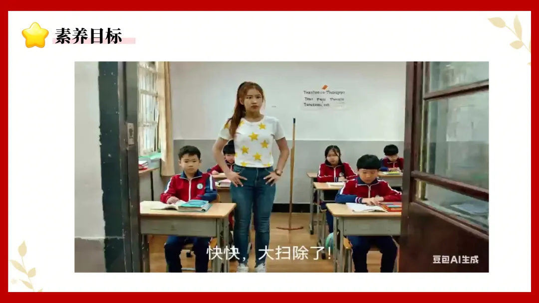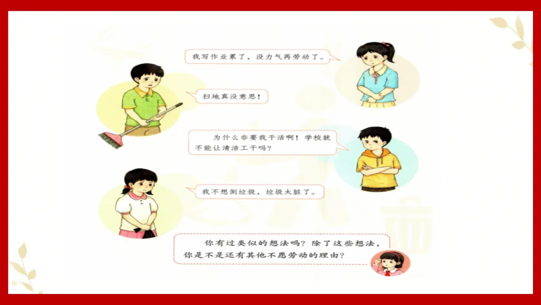 2. 提问引导:“同学们,在大扫除时,你有没有过和动画里同学一样的想法?为什么会不想劳动呢?”鼓励学生自由发言,分享真实感受。