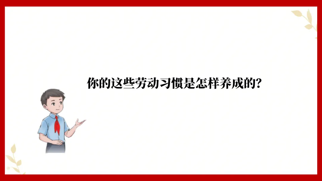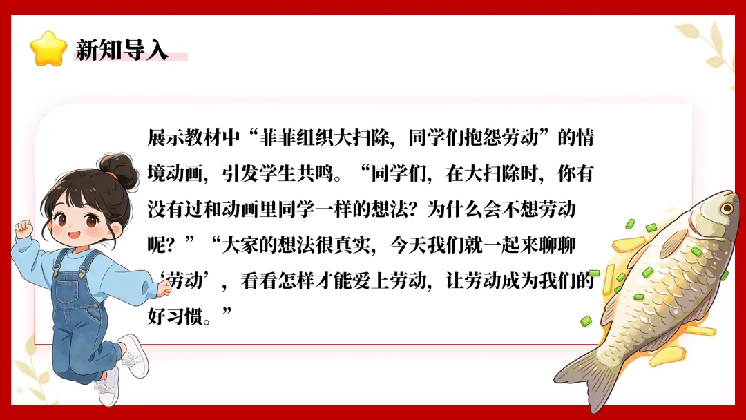 3. 顺势导入:“大家的想法很真实,今天我们就一起来聊聊‘劳动’,看看怎样才能爱上劳动,让劳动成为我们的好习惯。”