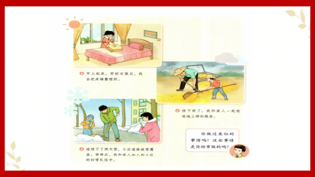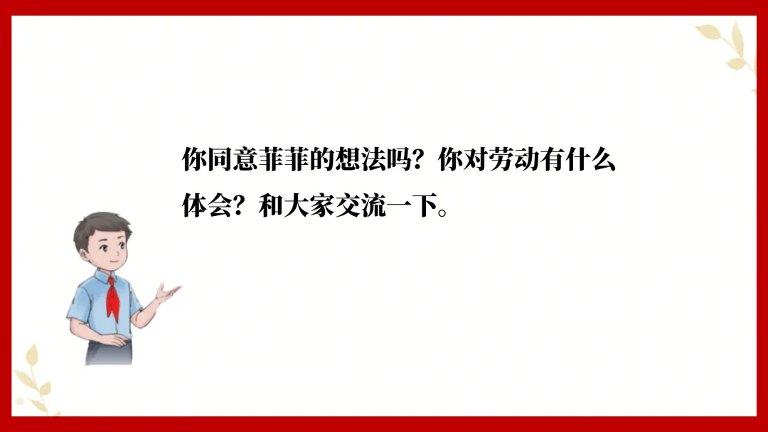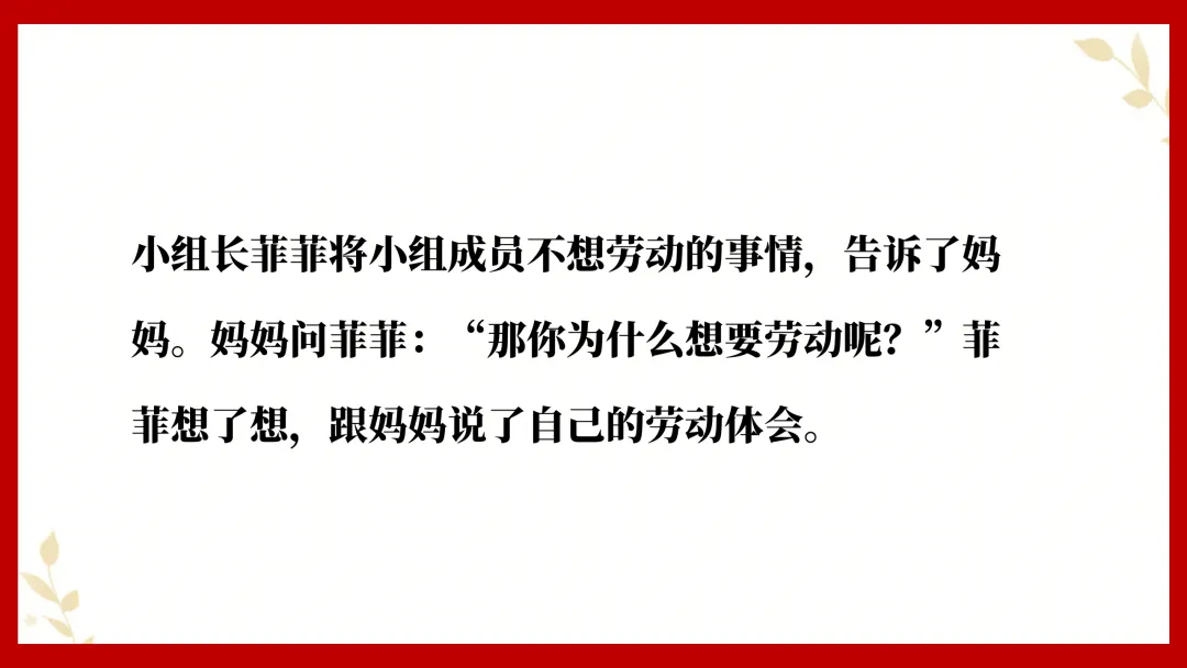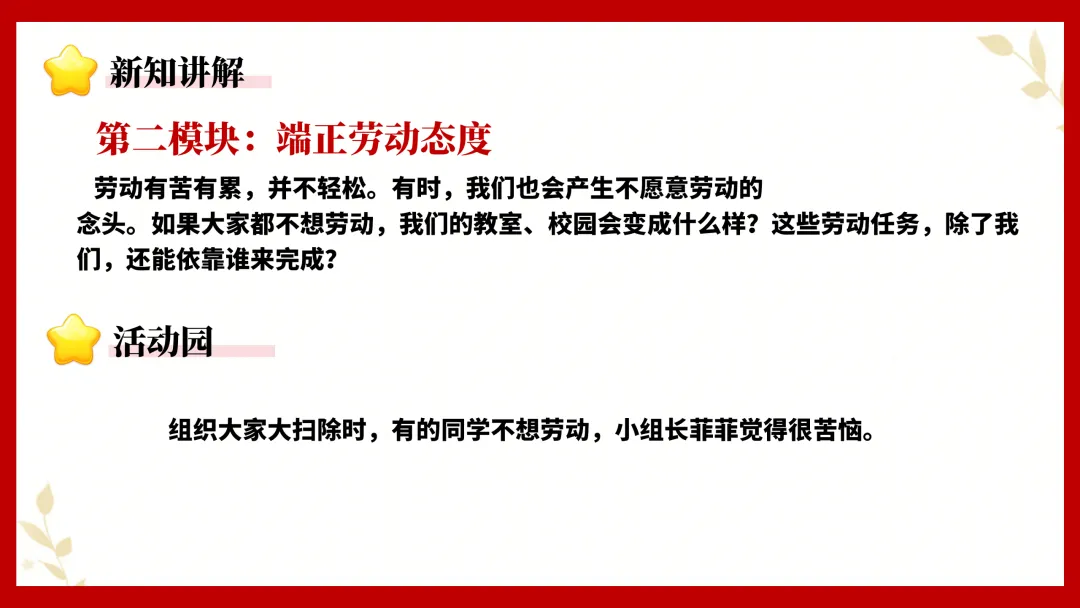1. 播放动画:展示教材中“菲菲组织大扫除,同学们抱怨劳动”的情境动画,引发学生共鸣。