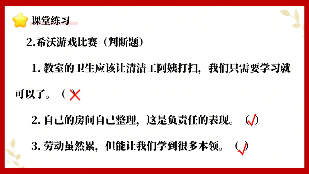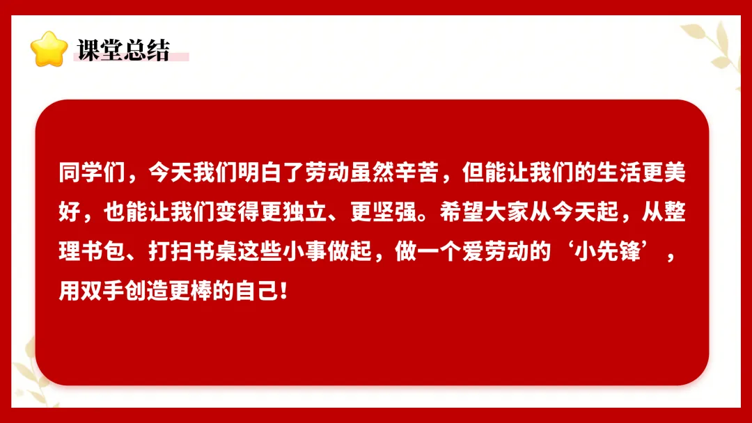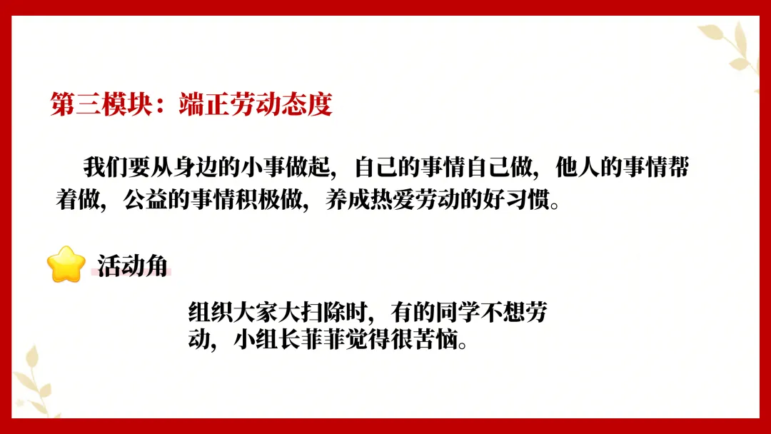 3. 法治观念:初步感知劳动既是权利也是义务,明白参与集体劳动是遵守校规班纪的体现。