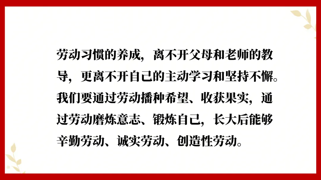 帮助学生端正劳动态度,认识到劳动的价值与意义;引导学生从身边小事做起,逐步养成热爱劳动的良好习惯。