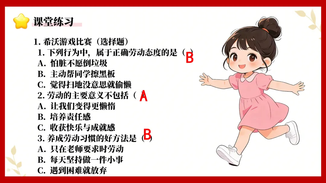 1. 希沃白板课件(含“大扫除情境”动画、劳动模范短视频、劳动习惯统计互动模板)