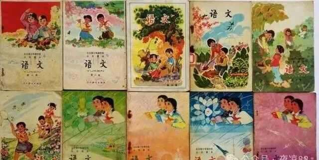 这个一色排开的叫老版语文书封皮,那年的教材没花头,纸有点糙,封面上的画可一点不潦草,红领巾飘着,天蓝得扎眼,男孩女孩都笑着,有在田里割麦的,有在果园摘桃的,还有骑在树杈上的,图案都直白,一看就是我们身边的人和事,我还记得爸妈夸的那句话,"你看那会的孩子,脸上净是干净劲",现在小孩的课本花里胡哨不少,可就是没有这些画的味道。