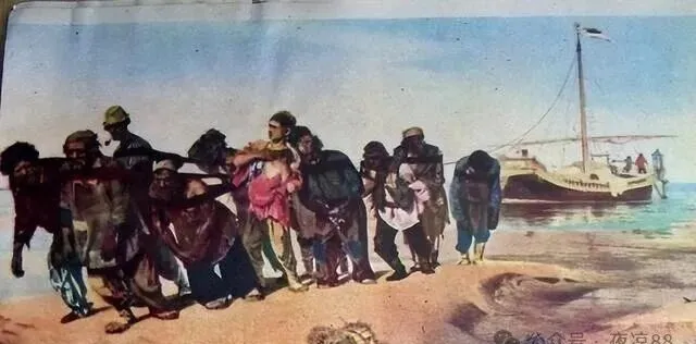 一整面横幅这画叫伏尔加河上的纤夫,那几个弯腰拉绳子的大人,个个脸晒得黑黢黢,脊背弓到极致,身上的麻布衣服都打了补丁,光影里压着说不出的苦劲,第一次翻到这页还纳闷咋画得这么憋屈,问爸爸,爸爸说"这是拉活的,苦日子就是要画这么明白,那时咱农村的重活也不比他们少",后来每每看这画,心里都挺不是滋味,但印象太深,一辈子忘不了。