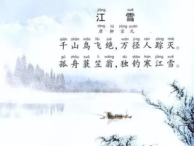 这个是江雪的插图,雪白的底子,远处的松林淡得快化开了,水面上一只小舟,一老翁独钓寒江雪,诗词就在上边夹着,字也轻轻淡淡的,爸说这画真讲究,"你看那一笔下去的空旷劲,画是静的,人心都跟着静下来了",小时候没太明白,长大再瞅,才觉出冷劲和孤独都是实打实地画出来的,这种水墨的温润,后来课本里也见得少了。