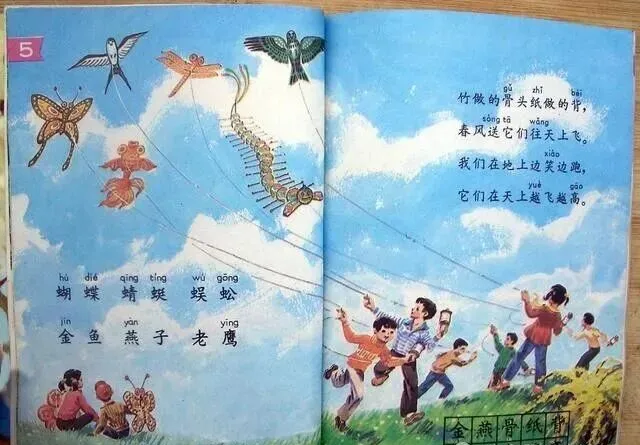 这页里飞满天的是春天放风筝那幅,蓝得晃眼的天,草地上孩子们蹦着跳着,手里牵着线,蝴蝶蜻蜓老鹰乱成一锅粥,旁边还有踩着泥巴的,风一吹汗一出,那种自由的春天味儿就是真的写进画里了,我记得小时候每 拿到这课书都要翻这张,悄悄把自己那只卖相一般的小风筝对着画比一比,心里还想啥时候也能放得这么高,妈在旁边洗衣服,就顺嘴说一句"书要好好看,别光惦记放风筝",可谁听得进去啊。