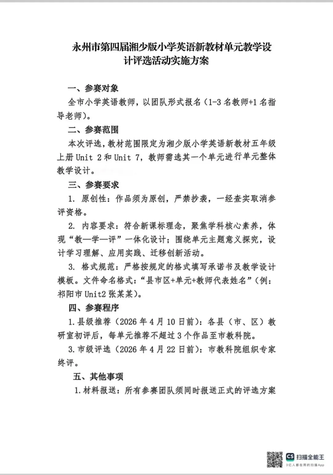 永州市~第四届湘少版小学英语新教材单元教学设计评选活动通知!截止日期:4月10日!