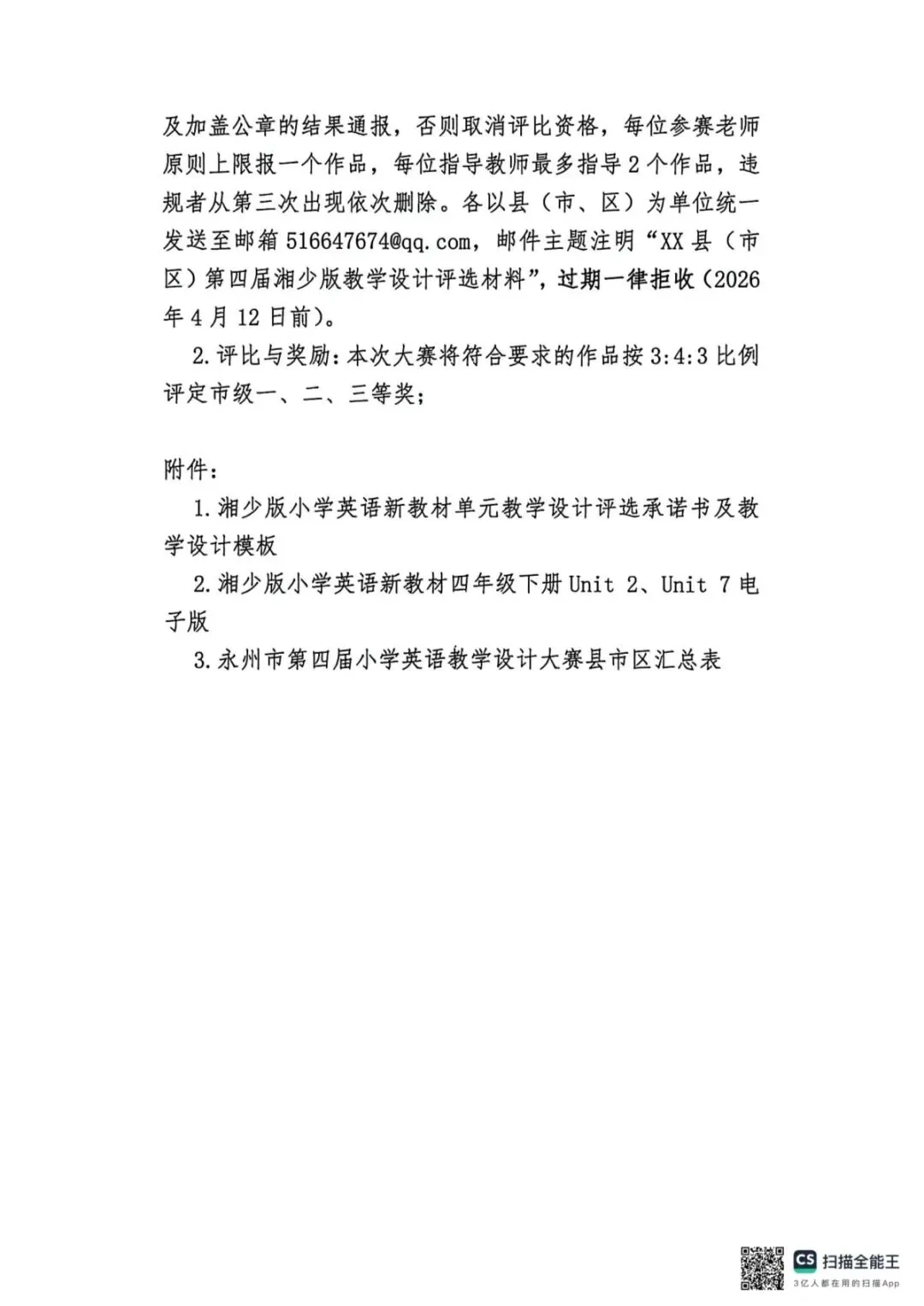 >永州市~第四届湘少版小学英语新教材单元教学设计评选活动通知!截止日期:4月10日!