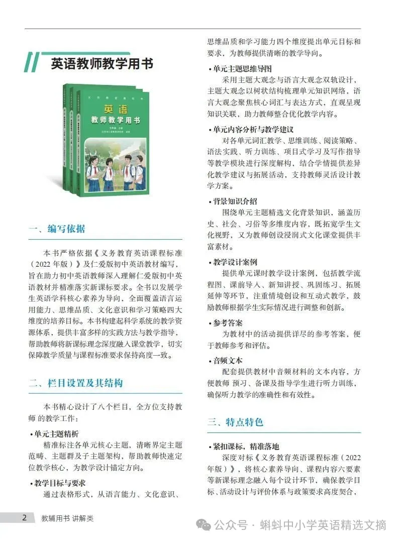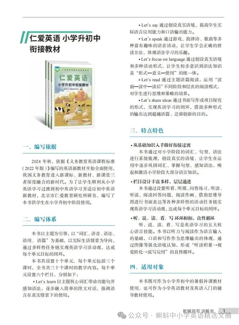 自2024年秋季学期开始新一轮义务教育课程改革以来,全国各地义务教育阶段各学科开始了新一轮新课标、新教材、新教学堂教学实践。由于十几年甚至二十多年的教学惯性思维,让很多教师接触到新教材后、发现相比之前有较大变化。首先,课程理念新(立德树人育人、核心素养统领);其次;单元整体教学设计的结构化知识体系;第三,教材“学习理解-应用实践-迁移创新”英语学习活动的闭环设计;第四,教学活动设计体现“教-学-评”一体化全流程设计;第五,每节课的活动观设计是小循环,单元整体活动设计又形成大循环;第六,时代性、传统文化很明显。为了回顾和交流“单元整体教学设计”经验,特此做一期专辑,下面展示的是河南省七年级上册Unit 5“单元整体教学课程”视频。欢迎广大教师收看(本视频仅用于教学教研学习只用,如有用于其它用途,请向仁爱官方授权)。