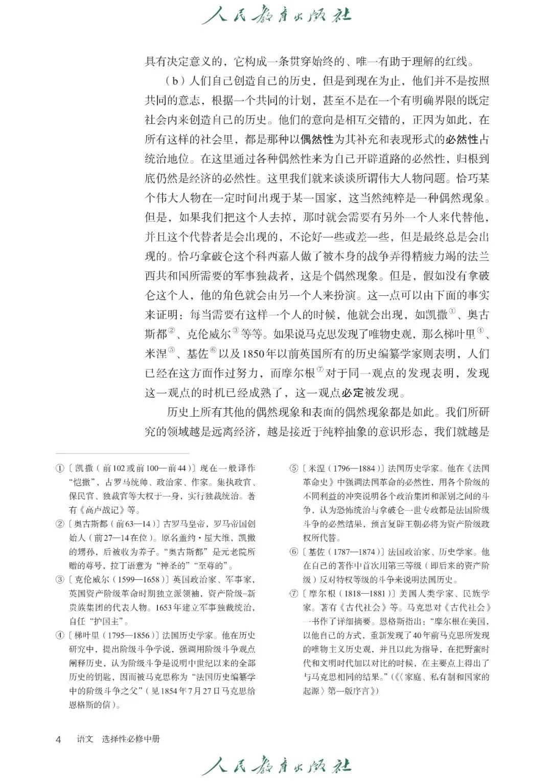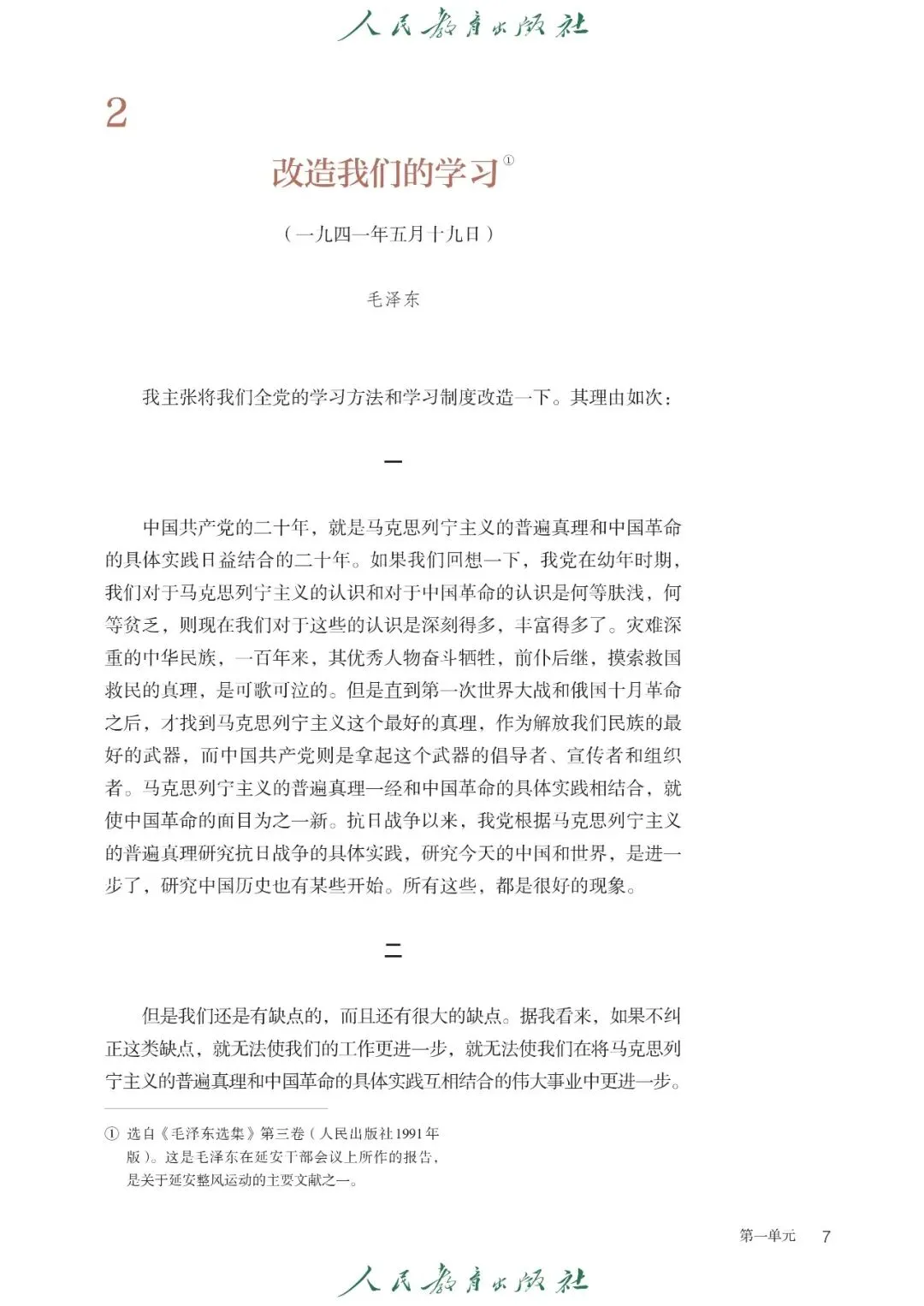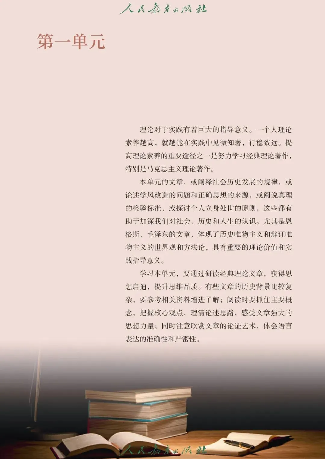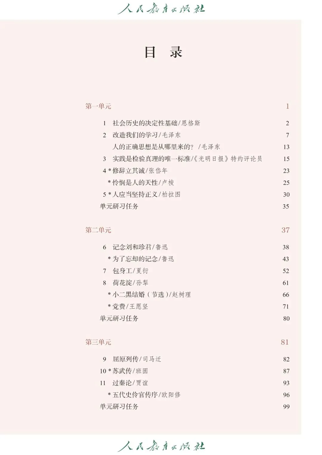 【1】第一单元:主要内容包含课文《社会历史的决定性基础》(恩格斯)、《改造我们的学习》(毛泽东)、《人的正确思想是从哪里来的?》(毛泽东)、《实践是检验真理的唯一标准》,核心内容有社会科学论文阅读、理论观点理解、论证结构分析、理性思辨与批判思维培养