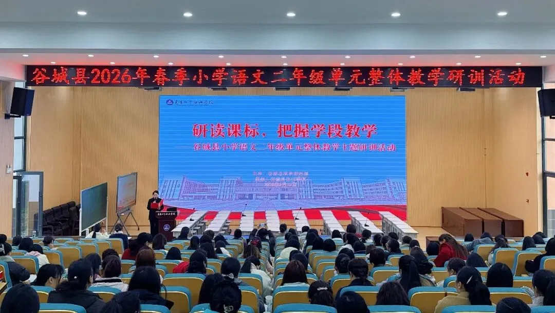 2026年3月19日至20日,谷城县小学语文、小学数学新教材培训及单元整体教学研修活动在襄阳四中谷山学校小学部报告厅顺利举行。本次活动由县教研室主办,襄阳四中谷山学校承办,围绕新课标理念下的教材使用与单元整体教学,安排了专题讲座、课例展示、集体备课观摩、互动研讨等环节,为全县小学教师搭建了学习交流的平台。3月19日上午,来自全县各小学的二、三年级数学教师及分管教学领导齐聚一堂,共同参与此次研训活动。本次培训内容丰富,形式多样,涵盖教材解读、课例展示、教学阐释、互动研讨等环节,旨在通过理论与实践相结合的方式,助力教师深入理解新教材、用好新教材。活动伊始,参会教师有序签到入场。上午8:20,培训正式拉开帷幕。首先,由县教研室郑琦老师作《二、三年级新教材结构与内容分析、新旧教材对比及实施建议》专题讲座,她从教材编写理念、内容结构、教学实施等方面进行了系统梳理,为教师们的教学实践提供了清晰的方向指引。随后,郑俊义老师执教三年级下册《多边形的认识》一课,通过生动的教学设计、层层递进的问题引导,激发了学生的探究欲望,展现了新教材理念下的课堂样态。紧接着,周洁老师带来二年级下册《倍的认识》课例展示,她以贴近学生生活的情境导入,巧妙设计任务驱动,课堂氛围活跃,教学目标落实到位。在课例展示后,陈卉、肖道静两位老师结合教研团队的思考,围绕两节课例进行了深入的教学阐释,剖析了教学设计背后的理念与实施策略。随后,参会教师积极参与评课议课,畅谈听课感受,交流教学困惑,现场研讨氛围浓厚。活动最后,郑琦老师作总结发言。她充分肯定了本次培训的实效性,并希望全体教师以此次研训为契机,继续深入学习新课标,积极探索教学新路径,不断提升专业素养和教学能力。本次培训不仅为全县小学数学教师搭建了一个学习交流的平台,也为新教材的顺利实施奠定了坚实基础。与会教师纷纷表示,将以更加饱满的热情投身课堂教学改革,努力打造高效、灵动、富有深度的数学课堂。3月20日上午,小学语文二年级单元整体教学研修活动如期举行。本次活动围绕“小学语文二年级单元整体教学”主题,安排了集体备课观摩、课例展示、专家讲座等环节,全县小学语文教师及“钟浩伟名师工作室”成员参加了此次活动。