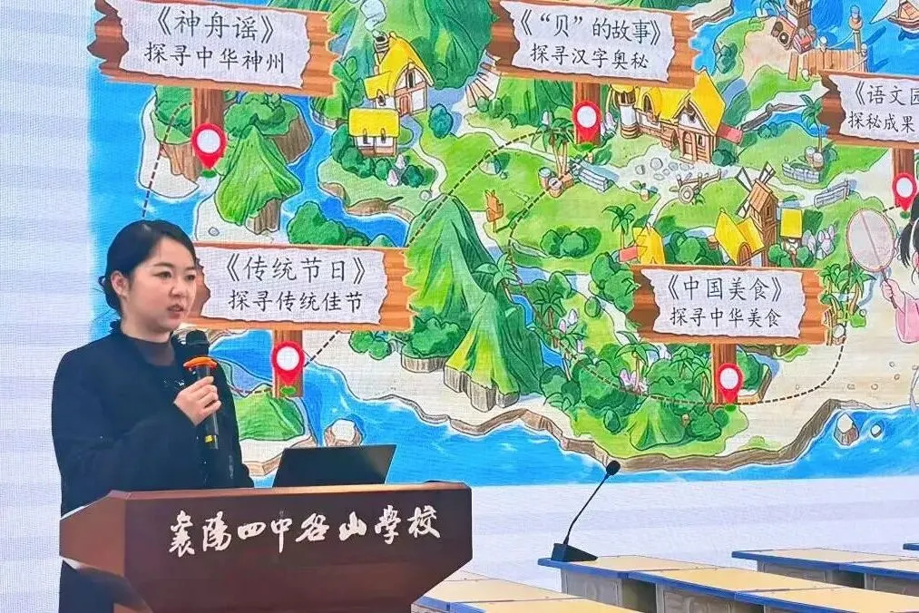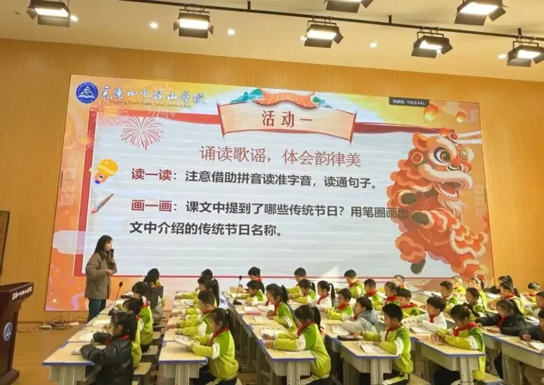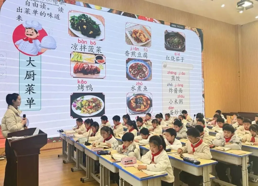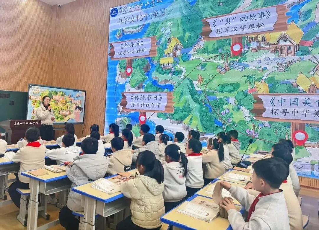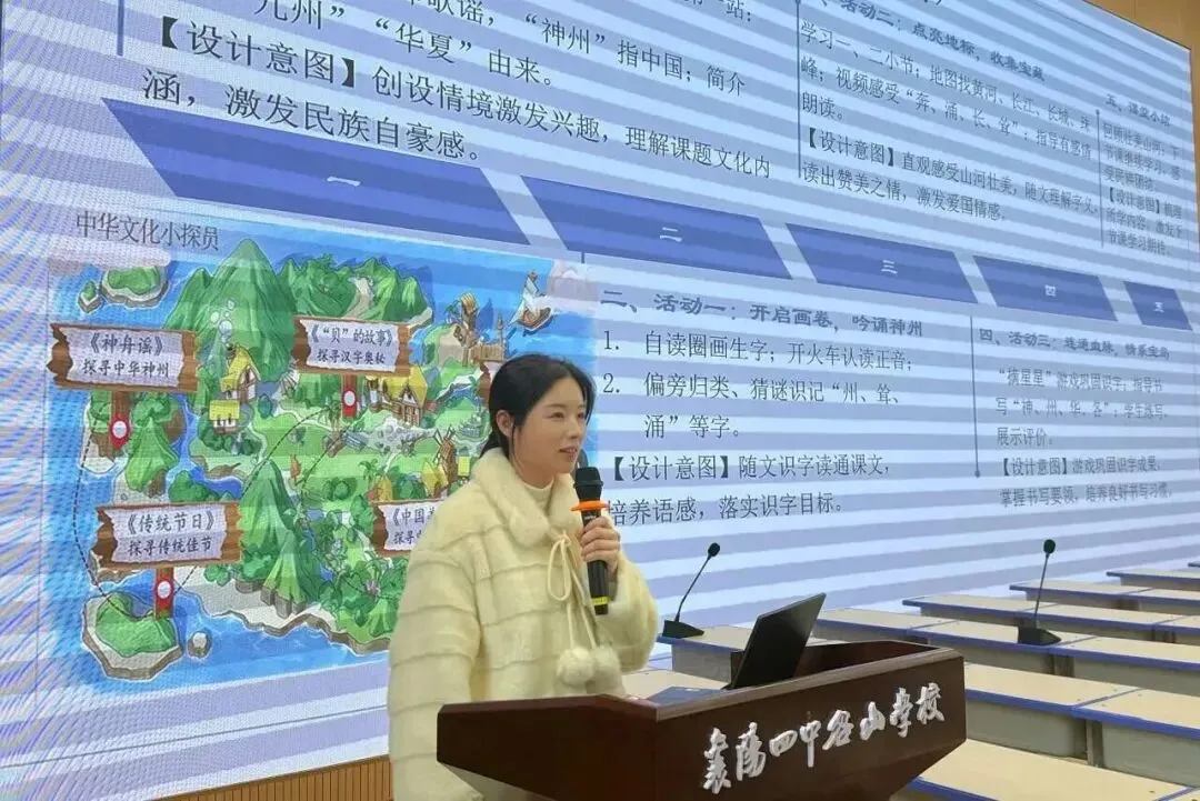 在集体备课环节,襄阳四中谷山学校饶鹏老师进行《单元整体教学说明》,将第三单元设计为“探寻中华神州”“探寻传统节”“探寻汉字奥秘”“探寻中华美食”“探秘成果大展示”五大学习任务,以闯关式情境贯穿单元始终。随后,曾凡双老师结合《神州谣》《贝的故事》进行说课。毛一帆老师代表教研组围绕任务五“探秘成果大展示”——即《语文园地三》和《口语交际》进行说课,分享了在“美食长廊”“汉字迷宫”“生肖游园”等活动中实现知识梳理与文化浸润的教学思路。三位老师说课环环相扣,呈现了完整的单元整体教学设计。说课环节结束后,杨婧婧老师执教《传统节日》。课堂通过诵读歌谣、时序梳理、讲述习俗等环节,让学生在识字学词中感受传统节日的文化魅力。赵若玉老师执教《中国美食》,以“为襄阳四中谷山学校制作美食菜谱”为任务驱动,设计了“报菜名”“选食材”“学烹饪”三个闯关活动,引导学生在归类识字中发现形声字规律,探究“火字旁”与“四点底”的联系。教学展示后,谷城县第一实验小学陈若辰老师、谷城县第一实验小学教科室负责人及县小学语文兼职教研员蔡群主任、襄阳四中谷山学校副校长陈有伟先后点评。大家一致认为,两节课将识字写字、语言积累与文化熏陶有机融合,体现了单元整体教学理念。