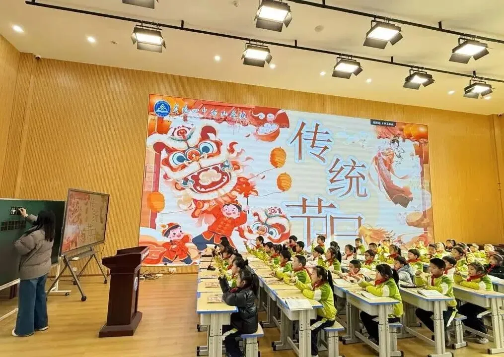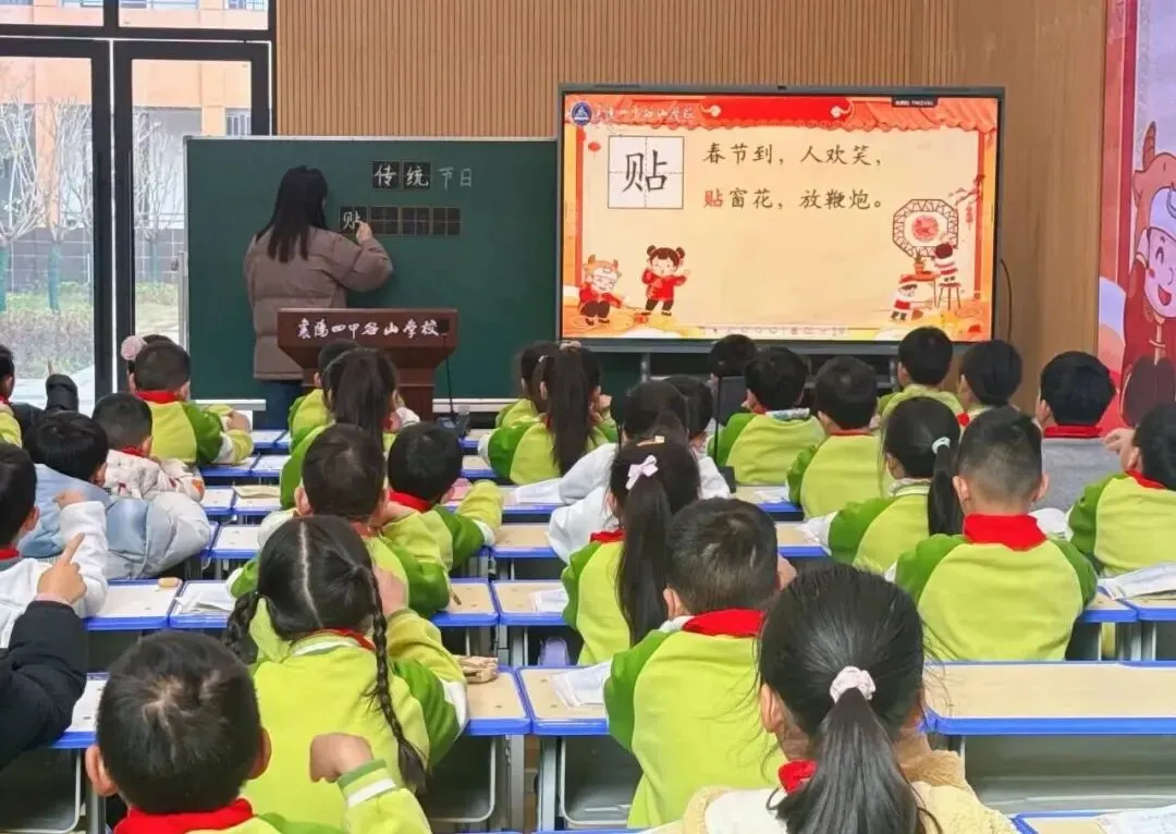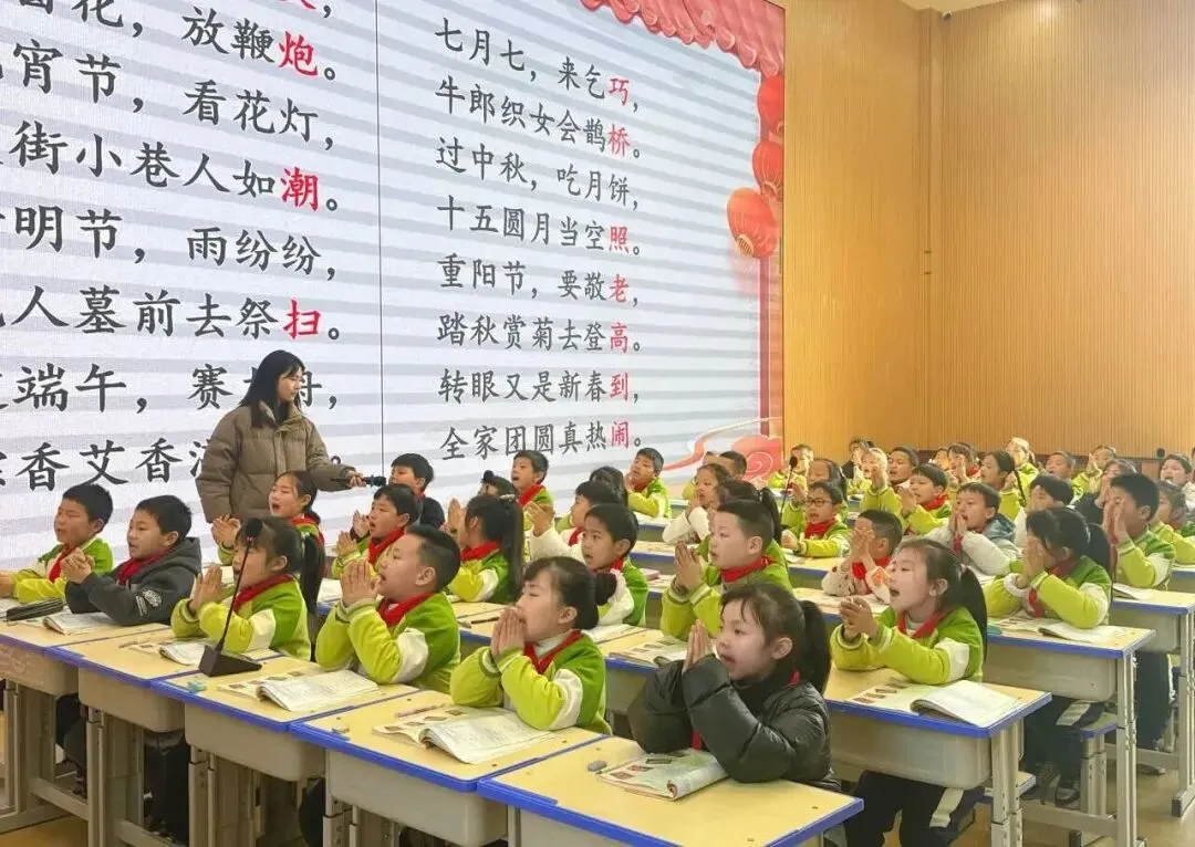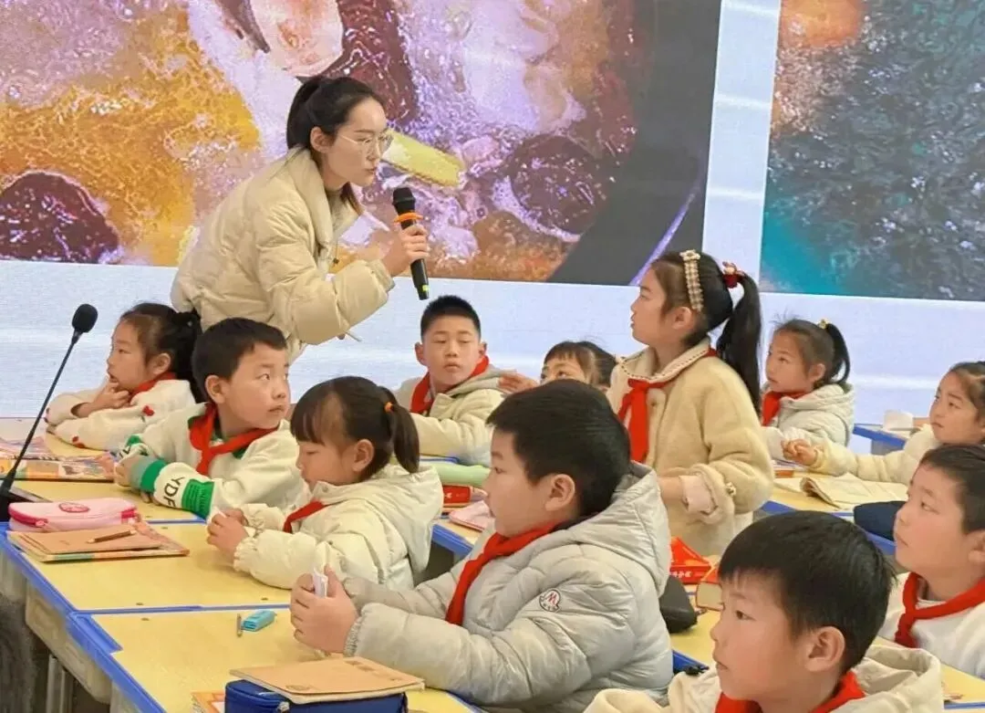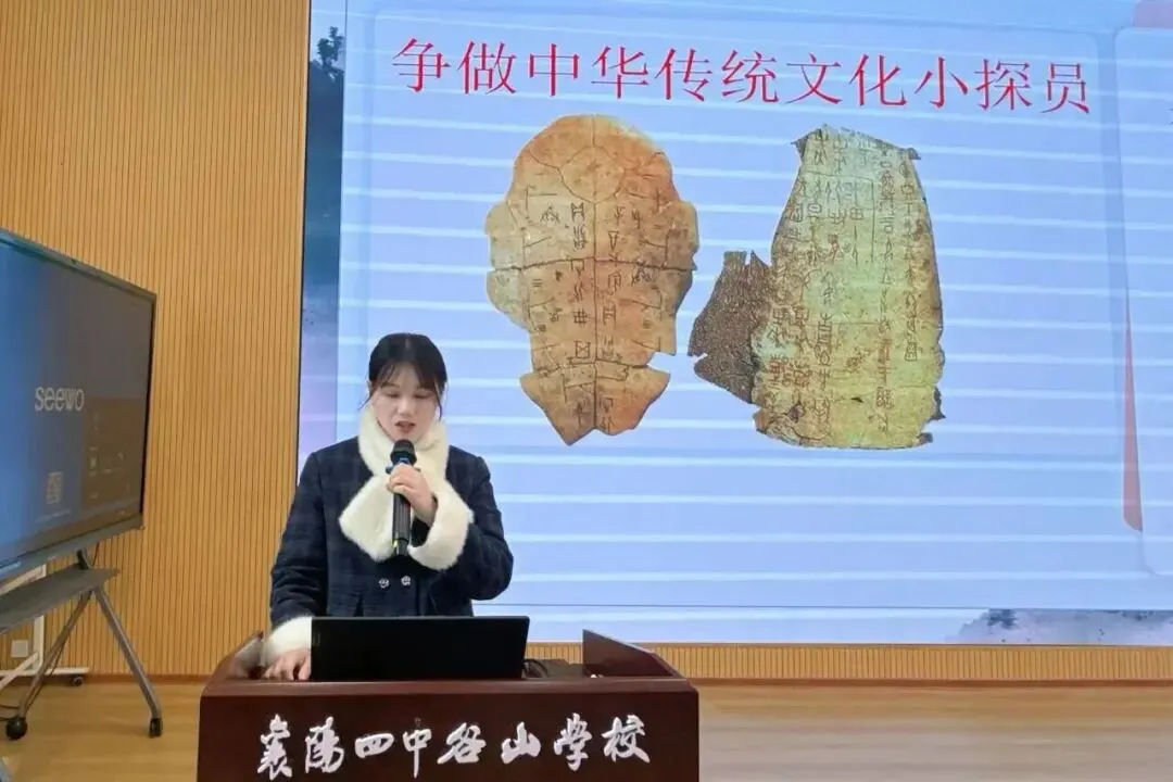 在集体备课环节,襄阳四中谷山学校饶鹏老师进行《单元整体教学说明》,将第三单元设计为“探寻中华神州”“探寻传统节”“探寻汉字奥秘”“探寻中华美食”“探秘成果大展示”五大学习任务,以闯关式情境贯穿单元始终。随后,曾凡双老师结合《神州谣》《贝的故事》进行说课。毛一帆老师代表教研组围绕任务五“探秘成果大展示”——即《语文园地三》和《口语交际》进行说课,分享了在“美食长廊”“汉字迷宫”“生肖游园”等活动中实现知识梳理与文化浸润的教学思路。三位老师说课环环相扣,呈现了完整的单元整体教学设计。说课环节结束后,杨婧婧老师执教《传统节日》。课堂通过诵读歌谣、时序梳理、讲述习俗等环节,让学生在识字学词中感受传统节日的文化魅力。赵若玉老师执教《中国美食》,以“为襄阳四中谷山学校制作美食菜谱”为任务驱动,设计了“报菜名”“选食材”“学烹饪”三个闯关活动,引导学生在归类识字中发现形声字规律,探究“火字旁”与“四点底”的联系。教学展示后,谷城县第一实验小学陈若辰老师、谷城县第一实验小学教科室负责人及县小学语文兼职教研员蔡群主任、襄阳四中谷山学校副校长陈有伟先后点评。大家一致认为,两节课将识字写字、语言积累与文化熏陶有机融合,体现了单元整体教学理念。