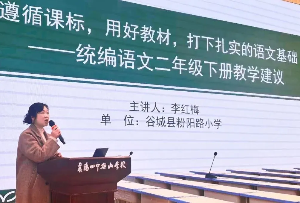 随后,谷城县小学语文兼职教研员、粉阳路小学李红梅老师作《遵循课标,用好教材,打下扎实的语文基础》专题讲座。她结合教材实例,提出三点建议:立足单元整体,明确任务定位;关注学情,设计适切活动;注重积累,夯实语文基础。讲座既有理念引领,又有方法指导,让与会教师受益匪浅。