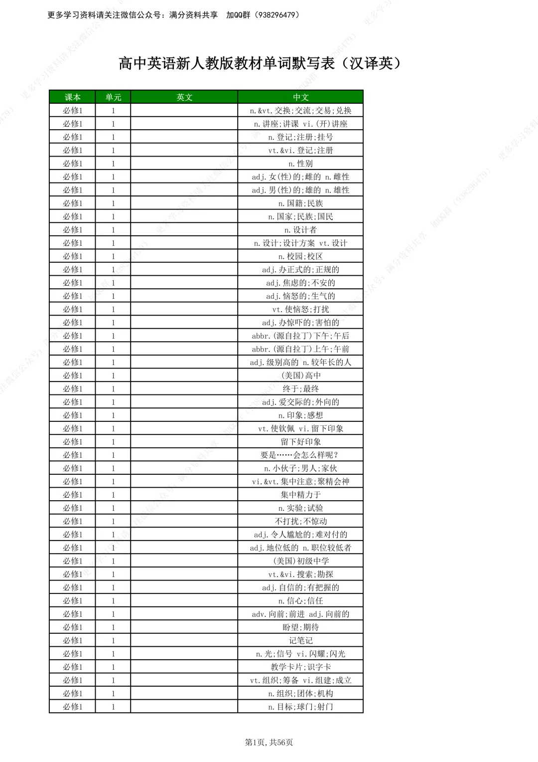 【高中英语】高中英语新人教版教材单词默写表(汉译英),电子版可打印