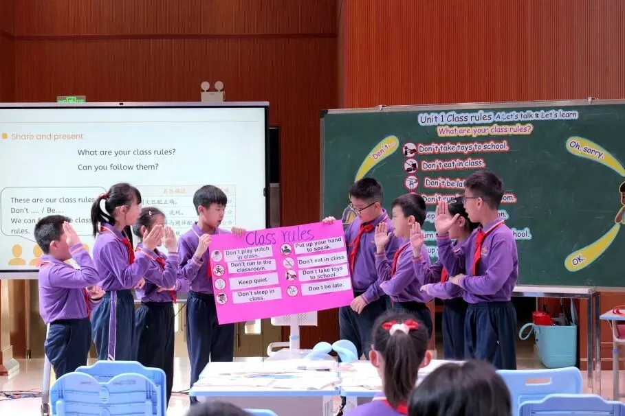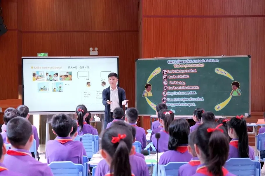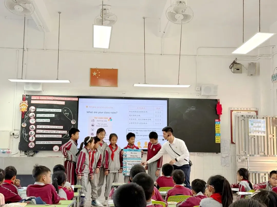 为深入贯彻落实《义务教育英语课程标准(2022年版)》理念,提升教师对新教材的理解与实施能力,2026年3月18日,东莞市小学英语新教材(四年级下册)研训活动在塘厦第二实验小学顺利举行。我校英语科组长刘衍鑫老师执教四年级下册Unit 1 Class rules A. Let's talk & learn What are your class rules? 立足扎实的专业素养与前沿的教学理念,在全市同行与专家观摩中完成了一节真实灵动、文化育人特征显著的小学英语对话与词汇融合课,深获好评。