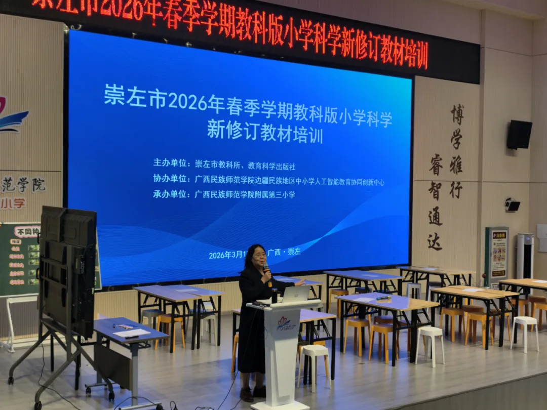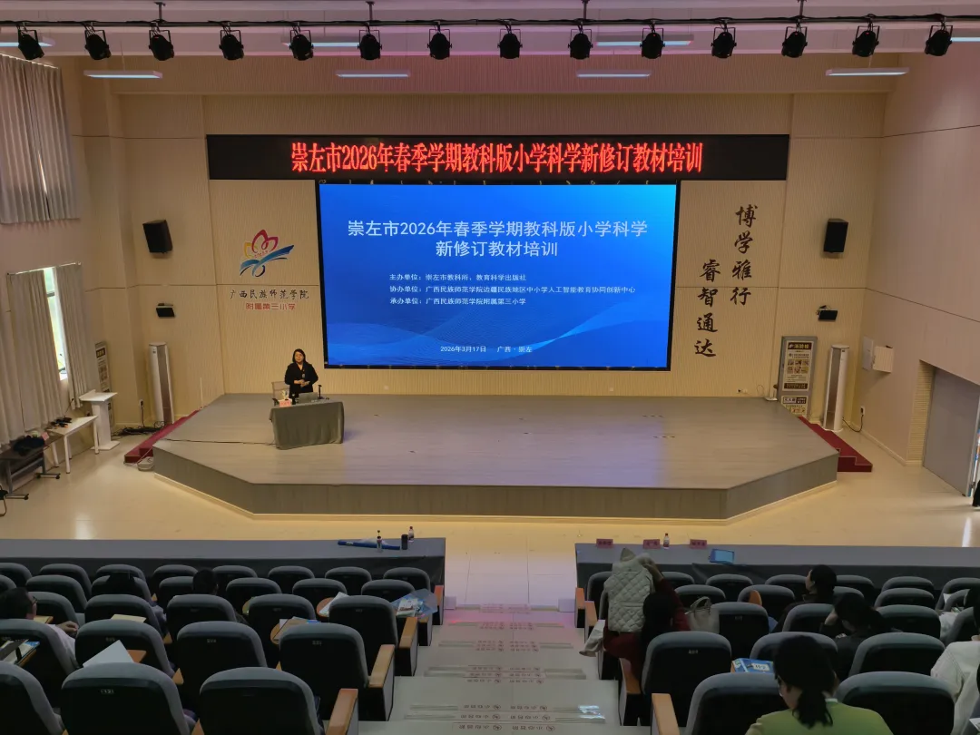 为深入理解和准确把握义务教育小学科学新修订教材的编写理念与教学要求,提升全市小学科学教师的专业素养与教学实践能力,3月17日,由崇左市教科所、教育科学出版社主办,广西民族师范学院边疆民族地区中小学人工智能教育协同创新中心协办的2025年全市小学科学新修订教材培训在广西民族师范学院附属第三小学进行。培训邀请了山西省教育科学研究院原基础教育质量监测与评估中心主任、科学教研员尚秀芬,太原市实验教学标兵、太原市实验教学能手徐滢老师亲临指导。