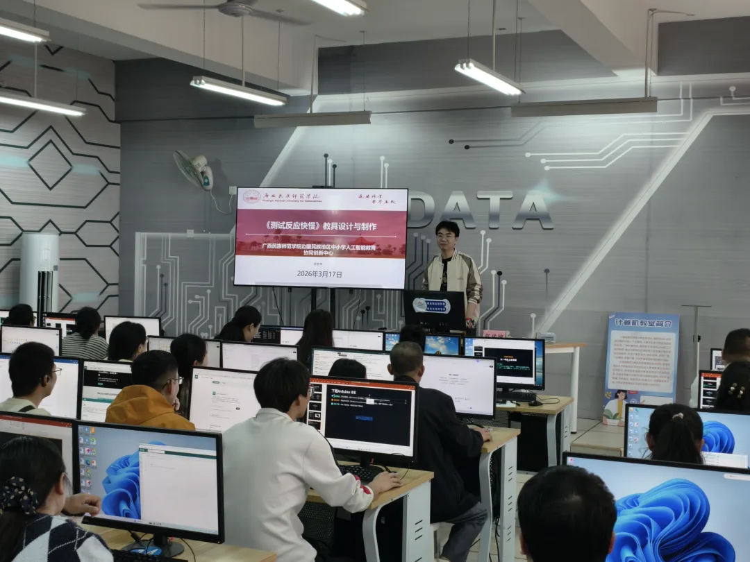 在实践研讨环节,广西民族师范学院边疆民族地区中小学人工智能教育协同创新中心教师团队的张世坤老师带来教师人工智能实践应用培训:二年级下册《测试反应快慢》教具设计与制作。助力人工智能教育更好地融入小学科学课堂,进一步推动边疆民族地区人工智能教育与小学科学教学深度融合,赋能边疆基础教育高质量发展。