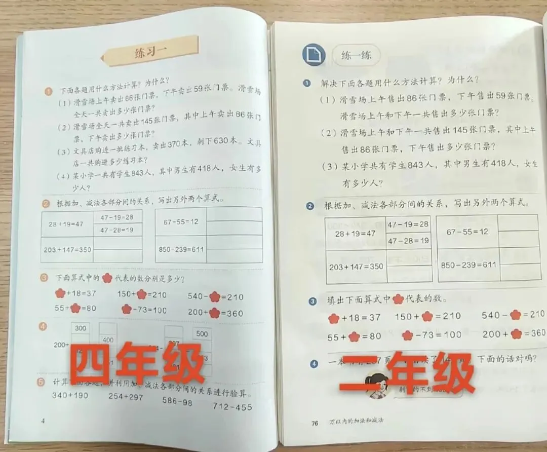 近日,不少家长发现小学数学二年级下册与四年级下册出现整页习题高度一致,题目、数字、情境几乎一模一样,瞬间刷屏家长圈。