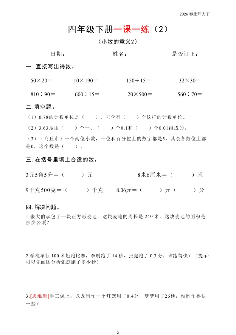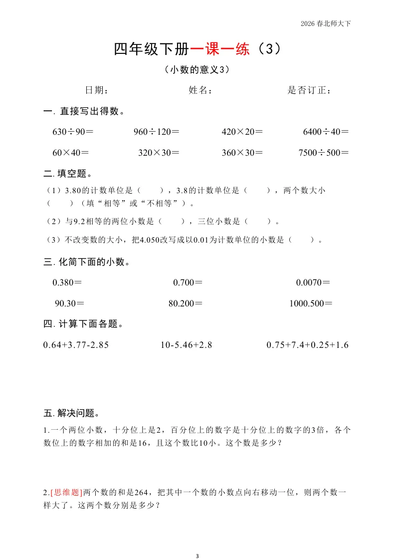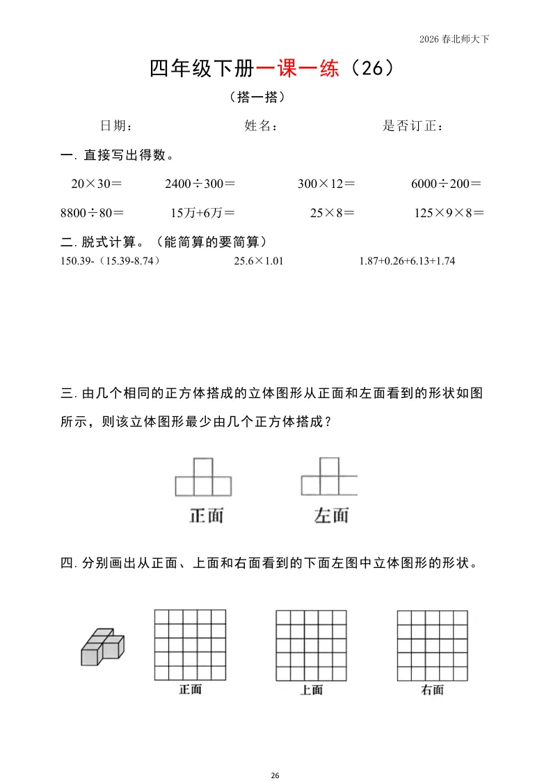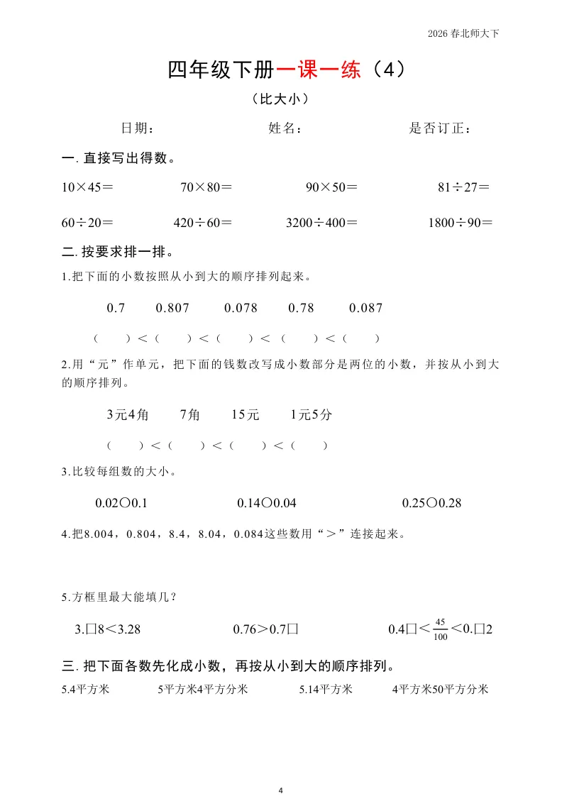 大家好我是英华阁;今天跟大家分享的是;北师版小学数学四年级下册《同步课本每日一练》(含答案)(26春)| 可下载打印