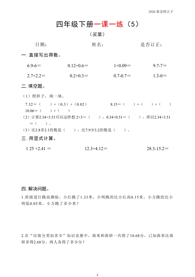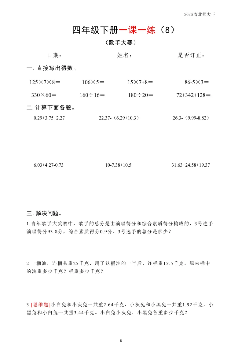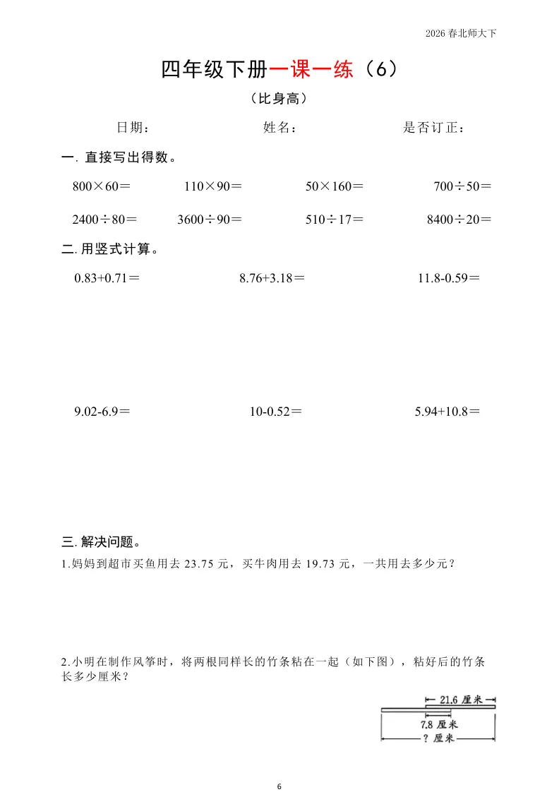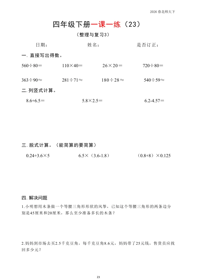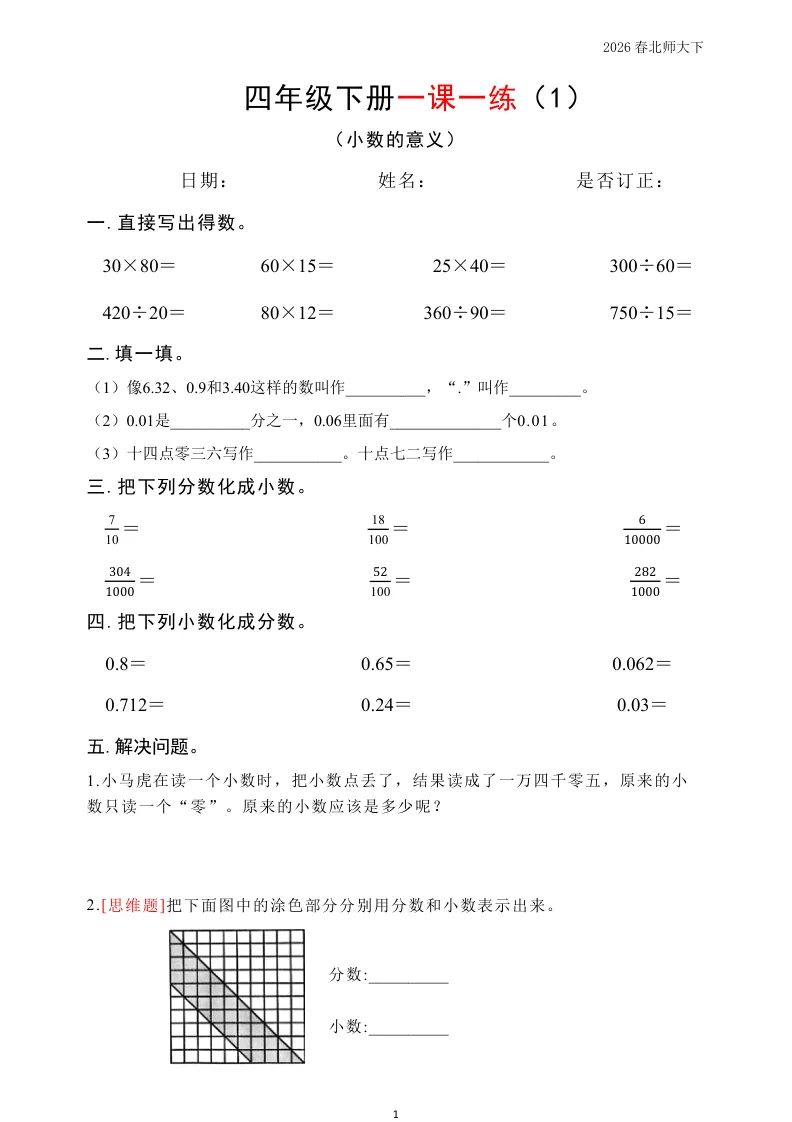 大家好我是英华阁;今天跟大家分享的是;北师版小学数学四年级下册《同步课本每日一练》(含答案)(26春)| 可下载打印