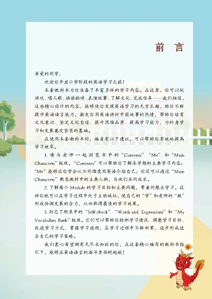 ,然后发送 电子课本 三年级英语启蒙关键册!2026秋川教版三年级英语上册新教材是三年级起点的英语启蒙用书,贴合低年级学生形象思维特点,注重听说兴趣培养和基础积累,共分为3个模块,每个模块包含3个单元和1个挑战单元,围绕与孩子生活紧密相关的主题展开,零基础友好,不用家长费心整理,孩子预习复习直接对照,轻松开启英语启蒙之路。全单元核心知识点精准拆解,适配课堂考点:Module A围绕礼貌的孩子展开,Unit1学习不同时间段的问候语和告别语,掌握Good morning/afternoon/evening、Hello/Hi、Goodbye/Bye等基础表达;Unit2聚焦自我介绍,学会用What's your name和I'm/My name is等句型询问和介绍姓名;Unit3学习sing、dance、run等动作词汇,能用I can表达自己的能力,挑战单元则综合运用本模块知识完成情景对话、词汇闯关等任务。Module B围绕奇妙的颜色展开,Unit4学习red、blue、green等颜色词汇,掌握What colour is it和Its等询问与描述颜色的句型;Unit5聚焦图片描述,学习flower、tree、bird等相关词汇,能用Look at my picture. It has...描述图片内容;Unit6学会用What's your favourite colour和My favourite colour is...表达颜色喜好,挑战单元通过颜色分类游戏、图片描述比赛巩固知识。Module C围绕有用的数字展开,Unit7学习数字1-10的英文表达,掌握How old are you和I'm... years old等询问与回答年龄的句型;Unit8聚焦购物场景,学习apple、banana、pen等商品词汇,运用Can I help you和I want...等购物句型;Unit9围绕水果展开,学习各类水果词汇,能用I like...表达喜好,挑战单元通过模拟购物、水果沙拉制作描述等任务,强化知识的实际应用。整册教材还重点要求掌握26个英文字母的认读、书写和发音,通过对话、歌曲、游戏等形式,培养孩子初步的听说能力和交际习惯,为后续英语学习筑牢基础。