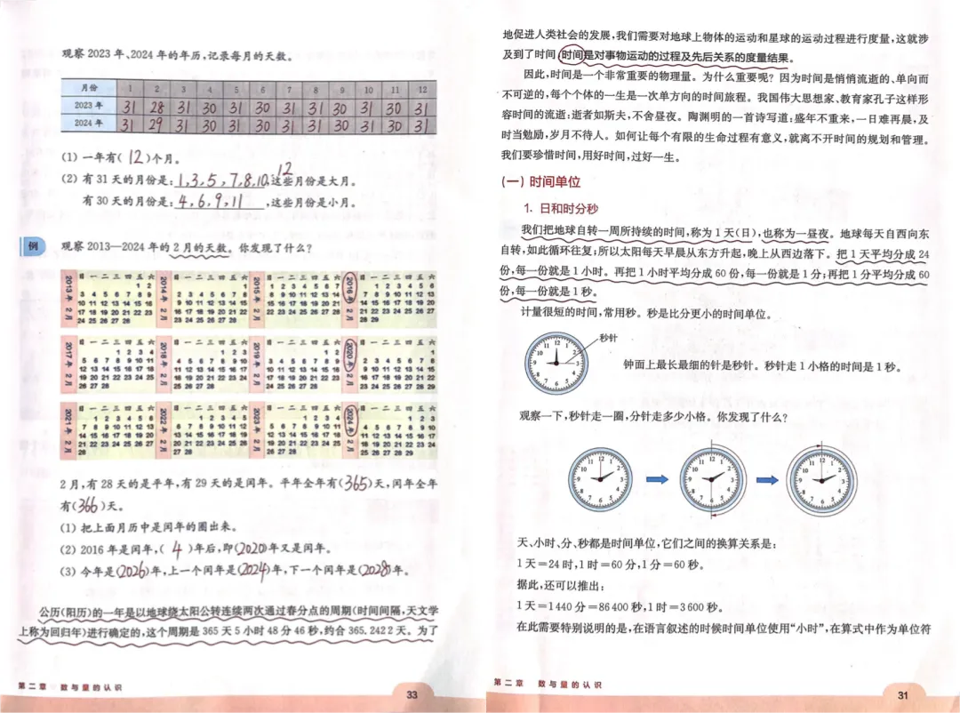 书中对“常见的量”并非简单单位与换算,而是紧扣“度量本质”,从学生的生活经验出发,搭建起“感知—理解—应用”的进阶路径。比如在讲解时间单位时,教材没有孤立灌输时、分、秒的进率,而是结合“体验时间长短”的真实情境,引导学生通过1分钟口算、1分钟跳绳等实践活动,建立对时间单位的直观感知;在质量单位的讲解中,通过“掂一掂1千克苹果”“称一称书本重量”等操作,让抽象的“克、千克、吨”转化为可触摸的具体体验。打破了我以往“重换算、轻感知”的教学误区,让我意识到,低年级数学教学的核心,不是让学生死记硬背单位关系,而是帮助他们建立稳定的量感,学会用数学的眼光观察世界。