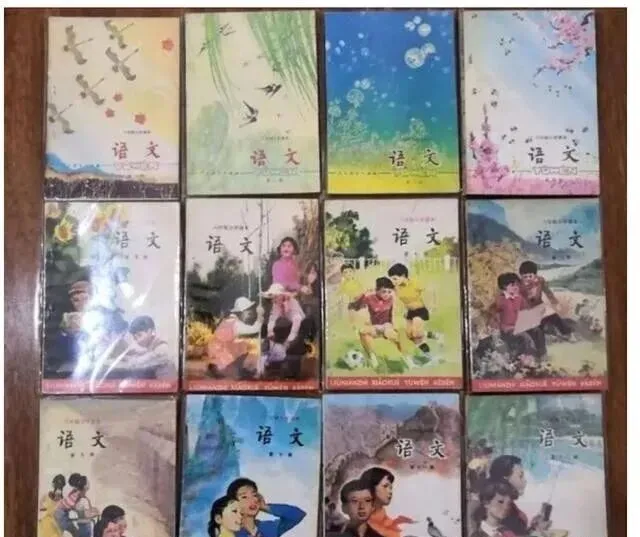 这排在一起的课本封面,图中全是六年制小学语文系列,当年的老物件没准你家老屋角还落着几册,外面的牛皮纸一褪,那一方粉中带彩的封皮马上露出来,左下角有印花,有的飞燕成群,有的是桃花海棠,也有那个特有的蓝绿色渐变,手指头摸过去光滑得很,一本一本实际上藏着谁家的暑假和谁的秋天,新书发下的头一天,学校操场樟树底下,娃子们掰开课本边对着插图边嚷嚷,“这一课会背了没”、“你这画跟我那版不一样”,那场面带着汗味油墨味,整个夏天都像刚翻过课本。