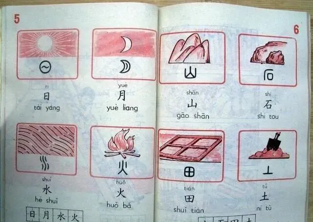翻到这个叫做“生字图”的页面,当年每个一年级娃肯定得先认这一大波字,太阳、月亮、山、石头,每个字边上配的小方块插画,清一色红笔勾轮廓,底下拼音标得整整齐齐,妈妈总说:“这拼音是走到哪儿都忘不了”,印象最深的就是“火”,一团火苗通红,像谁家灶堂里正旺着的柴火,自己小时候常常趁家里人不注意在上头描红线条,外面下大雨,一个人趴在饭桌边念“日月水火”,一念就是半天,心里最慌的不是写错字,是后面作业格子不够写。