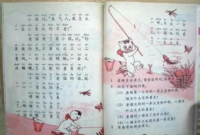 这只三心二意的小猫,现在一眼看见还是会发笑,图中这课讲的正是“小猫钓鱼”里那只爱瞟蜻蜓又丢鱼的小调皮,画风用的淡红底色,猫的眼珠贼亮,下巴鼓鼓的,鱼竿斜着甩到水里,每次读到这篇总有人大声模仿里面的口气,“老猫妈妈怎么说,只有专心才能钓到鱼”,有回在家吃饭,奶奶还指着弟弟念叨:“你看,这就是不专心啊,书上写得明明白白”,油墨的香味加上童心的怪想法,现在想来这一页几乎人人心里有个位置,“你还记得小猫钓上来几条鱼吗”,提起来屋里就有人接,“钓不上,东瞧西看的”。