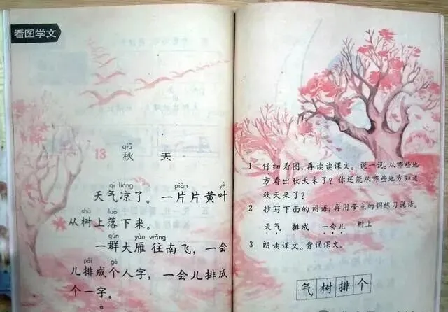 秋天那一课的插画,粉白一片画出树叶飘黄的猛烈,画面最惹眼的就是树杈上的大雁,一排人字一排一字,空中成群结队,下面写着“天凉了,树叶黄了”,那会儿每天早读,老师往黑板上一写就是这一段,班里总有人声音底气不足,嘴里哼哼却不敢开口,人后一片吐舌头,“你再背一遍,别卡壳了”,语文书左一页右一页画都是诗意,秋风刚起,操场柳树下就有人学着画里的姿势比划,树叶掉了一地,回去追着捡贴到课本里压着,第二天翻开还能闻到叶子混着一星半点的油墨味。