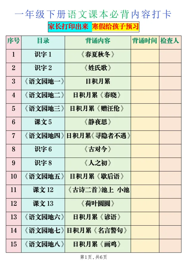 《寒假作业每日打卡》1-6年级(语文 数学)