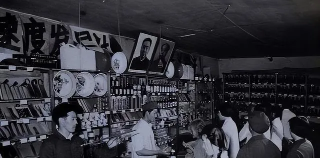 先看第一张,味道就出来了。货架挤得满满当当,搪瓷、刀具、盘子、瓶瓶罐罐全都规规矩矩摆着,柜台里的人站着,买东西的人也都老老实实围着。那时候的商店跟现在不一样,不是自己随手挑,更多是隔着柜台看、指着东西说、等人拿给你。你注意看那个空间,灯光不亮,东西却很扎实,像那种“买回去能用很多年”的感觉。