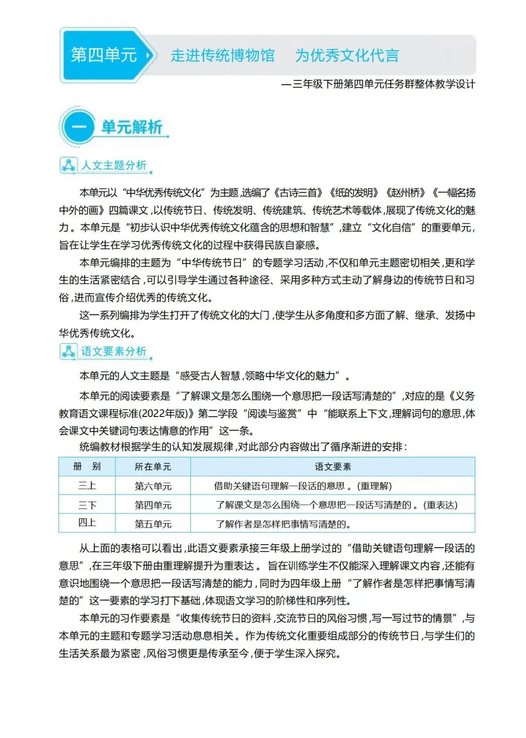 当前位置:首页>小学教材>【2026新教材】小学语文三年级下册大单元教学第四单元:走进传统博物馆, 为优秀文化代言(框架版)