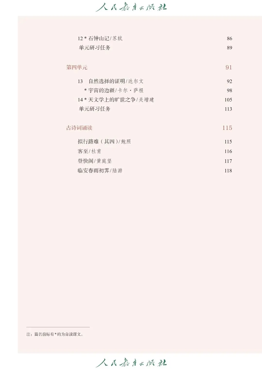 【2】第二单元:主要内容包含课文《拟行路难(其四)》(鲍照)、《客至》(杜甫)、《登快阁》(黄庭坚)、《临安春雨初霁》(陆游)、《永遇乐·登京口北固亭怀古》(辛弃疾,复习拓展)、《菩萨蛮·书江西造口壁》(辛弃疾),核心内容有古典诗词曲鉴赏、意象意境分析、格律常识、情感主旨与艺术手法